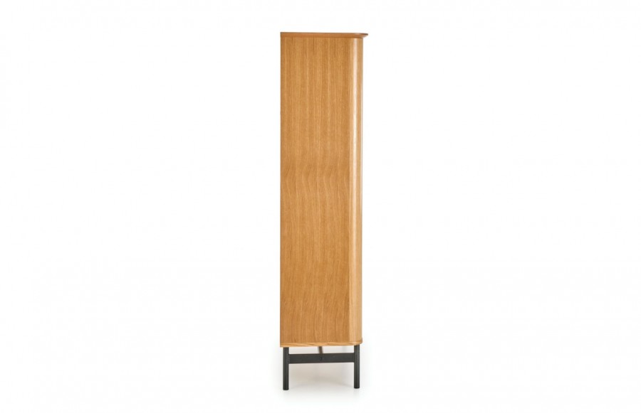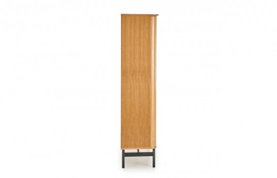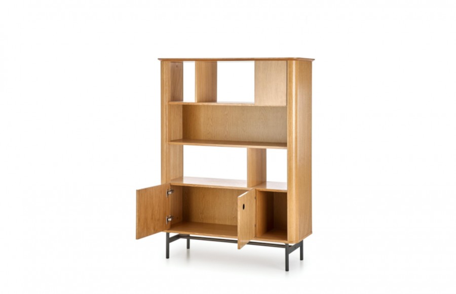 Regał SMART 02 - to nie tylko funkcjonalny, ale także elegancki mebel retro, doskonały do salonu, sypialni czy biura. Wykonany z wysokiej jakości forniru, zapewnia trwałość i odporność na uszkodzenia. Z paroma półkami i szafką, umożliwia przechowywanie różnych przedmiotów, od książek po dekoracje. Dzięki unikalnej formie i charakterystycznemu wyglądowi, regał może stanowić interesujący akcent w nowoczesnych wnętrzach, nadając im niepowtarzalnego stylu. Dodatkowym elementem są czarne, stalowe nóżki malowane proszkowo, które dodają regałowi surowości i charakteru.
