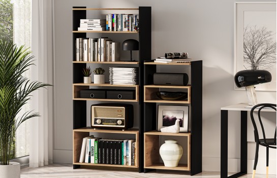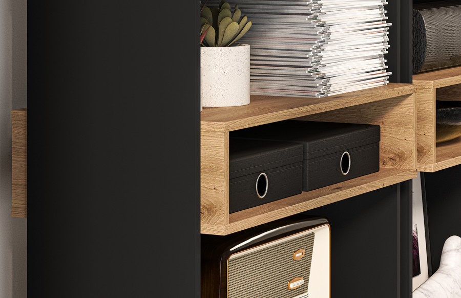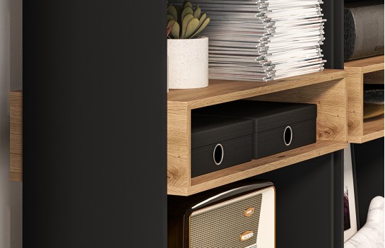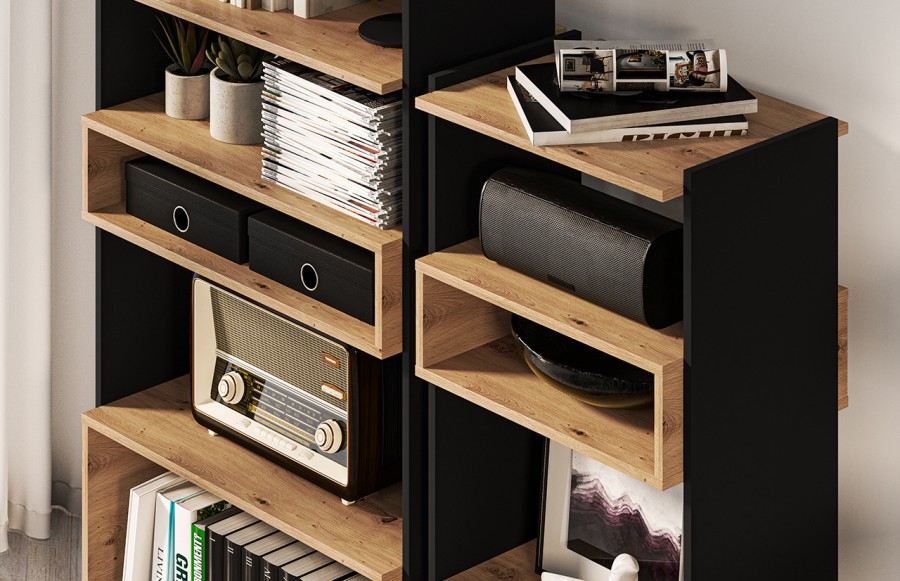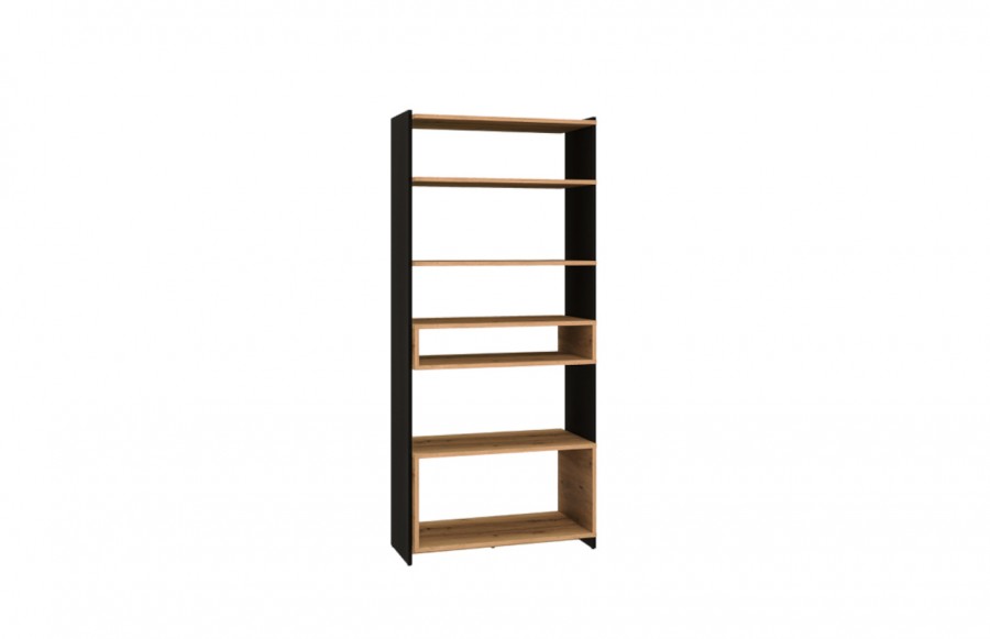 Regał TRIS 04 - to imponujący mebel o dużej pojemności, idealny do przechowywania licznych książek i dokumentów, utrzymany w industrialnym klimacie. Dzięki eleganckiemu połączeniu koloru dębu artisan z czernią, nadaje pomieszczeniu nowoczesnego wyglądu z subtelnymi akcentami loftowymi. Wykonany z najwyższej jakości płyty laminowanej i obrzeży ABS, ten regał zapewnia trwałość i solidność, łącząc styl z funkcjonalnością.
