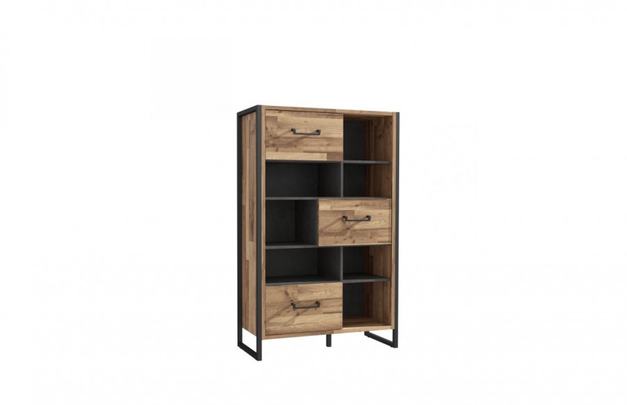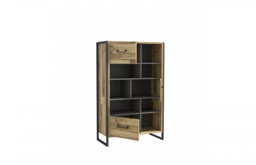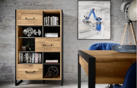 Regał HUD - to nowoczesne i funkcjonalne rozwiązanie do salonu, jadalni czy pokoju dziennego, charakteryzujące się prostotą i elegancją. Jego surowy, naturalny design inspirowany dębem klepkowym z ciemnymi wstawkami nadaje wnętrzu oryginalnego charakteru. Z szeroką gamą otwartych i zamkniętych półek, regał HUD oferuje dużo miejsca do przechowywania książek, dokumentów i drobiazgów, doskonale współgrając z innymi elementami kolekcji lub jako samodzielny mebel. Solidna konstrukcja z płyty meblowej z eleganckimi metalowymi uchwytami i czarnymi nóżkami dodaje regałowi funkcjonalnego i stylowego wykończenia.