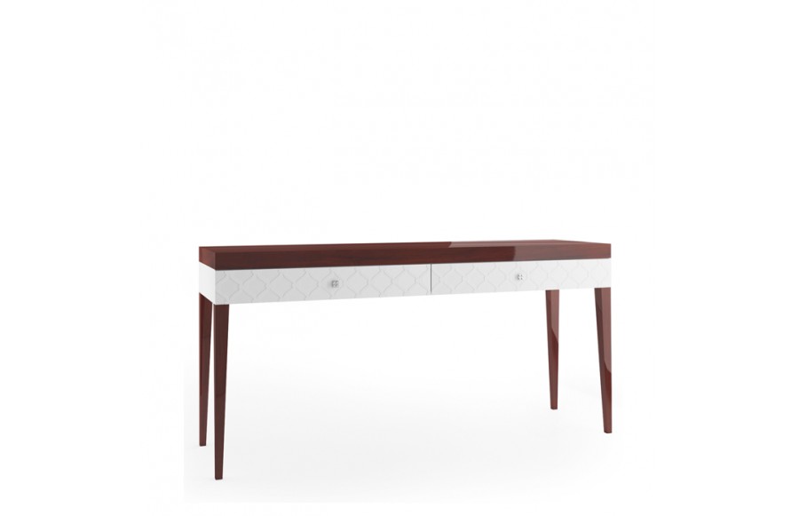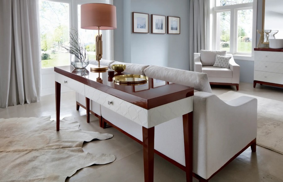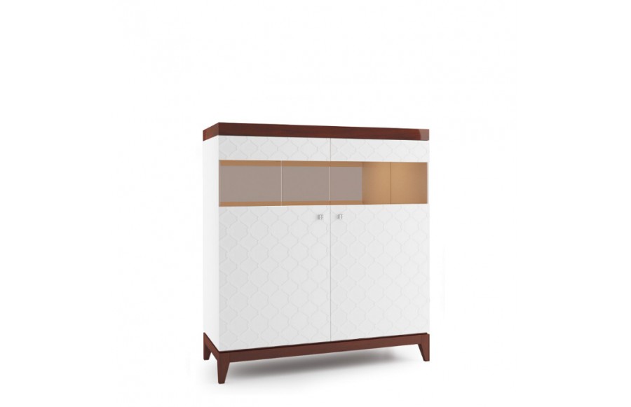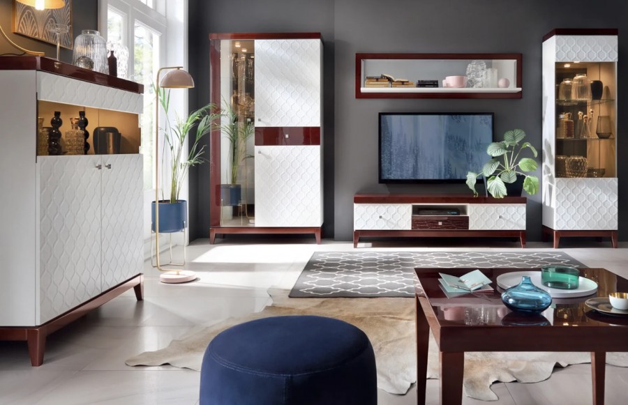 Kolekcja VIA - to niezwykła propozycja dla osób poszukujących elegancji i funkcjonalności w jednym. Meble VIA dodadzą ekstrawagancji każdemu wnętrzu, łącząc nutę elegancji z szczyptą szaleństwa. Nietuzinkowy wzór przyciąga wzrok, a uchwyty z kryształkami Swarovskiego igrają ze światłem, dodając meblom niepowtarzalnego charakteru. Kolekcja VIA przeznaczona jest dla osób ceniących nowoczesne wzornictwo i ekskluzywne wykonanie. Matowe fronty nadają meblom wyszukany i oryginalny charakter, podkreślając jednocześnie piękno struktury drewna i głębię koloru. Blaty mebli o wysokim połysku dodają elegancji, podkreślając mahoniowy odcień okleiny naturalnej. Zastosowanie delikatnego, refleksyjnego szkła w witrynach dodaje meblom wyjątkowego uroku. Dzięki dużej ilości brył, meble tej kolekcji zaaranżujemy w każdym pomieszczeniu, zarówno w jadalni, sypialni, jak i pokoju dziennym. Dodatkowo, uzupełnieniem kolekcji są meble wypoczynkowe, również z funkcją spania, zachowane w tej samej stylistyce, stanowiąc doskonałe uzupełnienie salonu.
