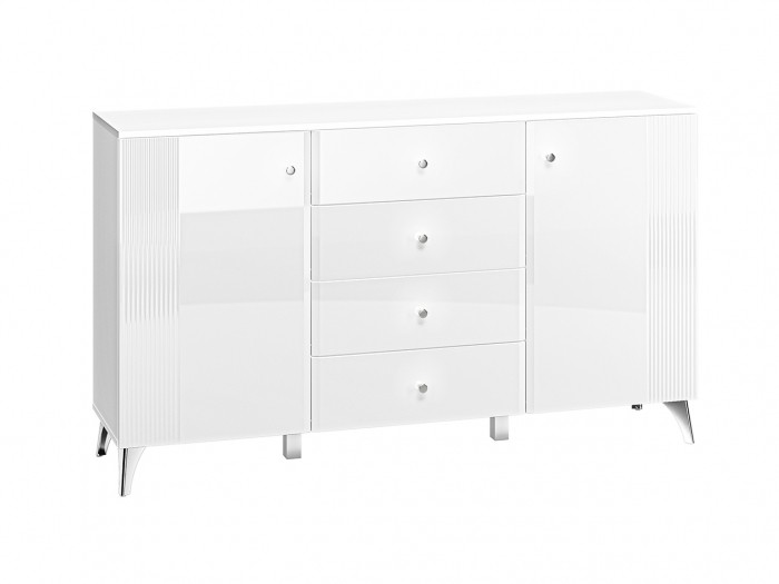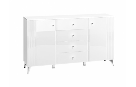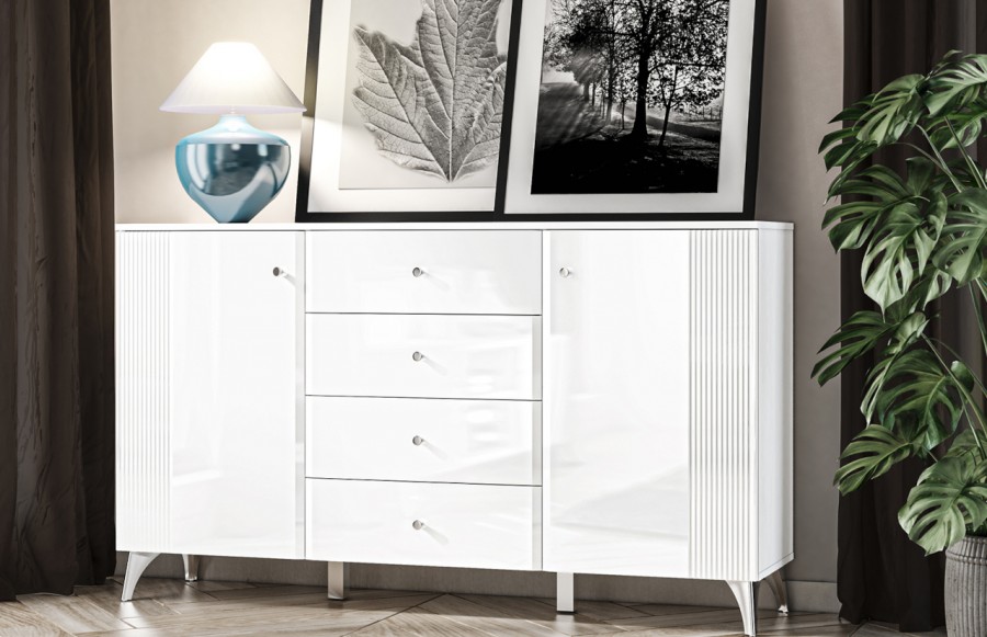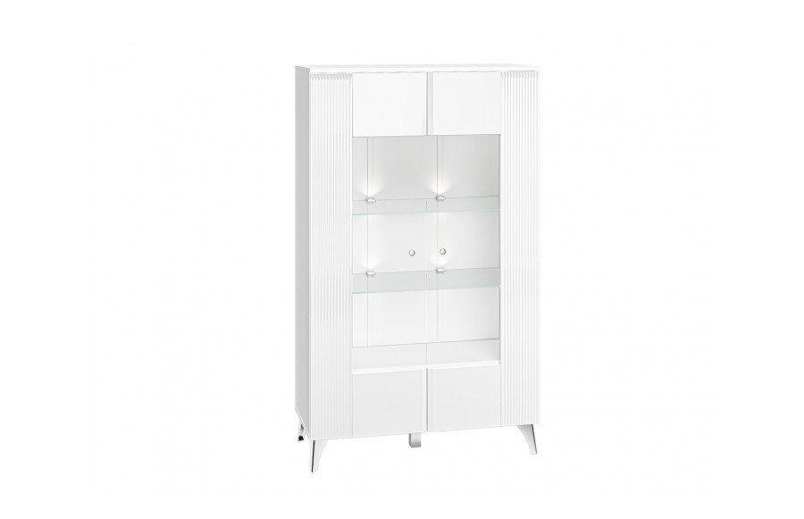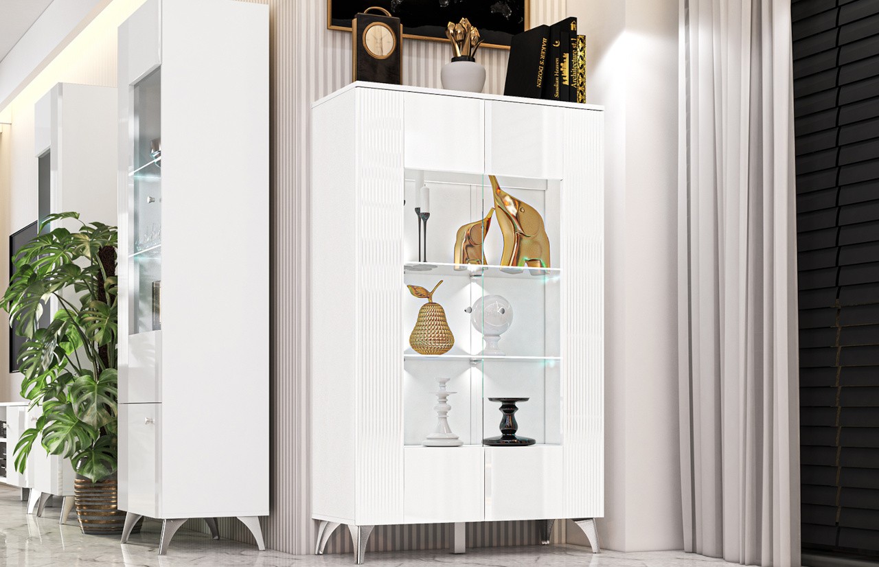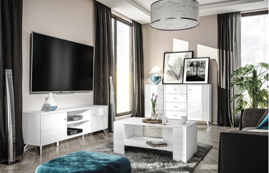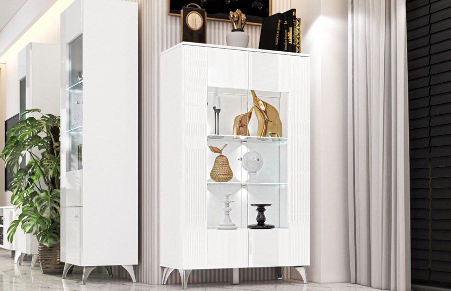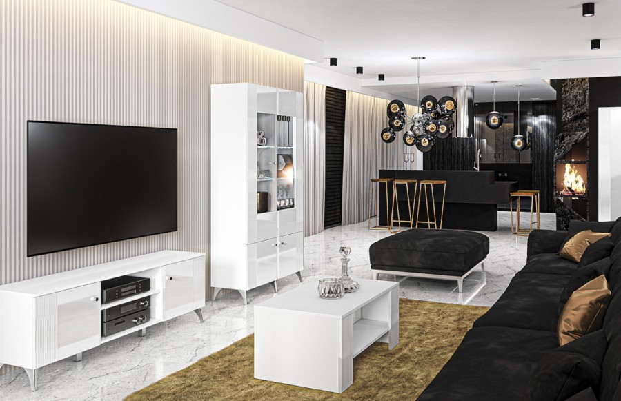 Kolekcja VILLA - to prawdziwe arcydzieło nowoczesnej elegancji w świecie meblarstwa, tworząca niepowtarzalny klimat w każdym salonie. Jej niezaprzeczalnym atutem są starannie frezowane fronty oraz lśniące chromowane nóżki i uchwyty, które dodają meblom wyjątkowego charakteru. Wykorzystanie alpejskiej bieli w połączeniu z białym połyskiem nadaje meblom jasną, elegancką kolorystykę, a błysk bieli przechodzący w dekoracyjne frezowania na frontach dodaje im wyjątkowej ekskluzywności. Stalowe, chromowane nóżki i uchwyty harmonijnie współgrają z całością, nadając meblom spójny i nowoczesny wygląd. Oświetlenie witryn idealnie podkreśla eksponowane przedmioty, dodając im dodatkowego blasku i sprawiając, że kolekcja VILLA staje się nie tylko funkcjonalnym elementem wystroju, ale także jego eleganckim akcentem. Wybierając meble z kolekcji VILLA do swojego salonu, optycznie powiększysz oraz rozświetlisz przestrzeń, tworząc niezapomniany, elegancki klimat.