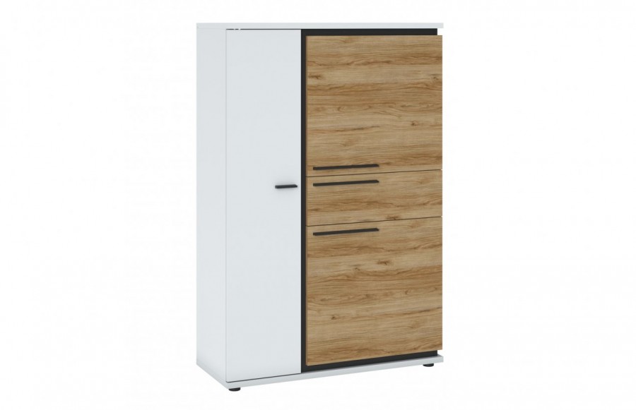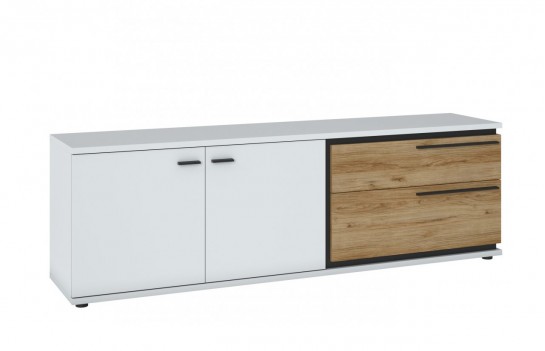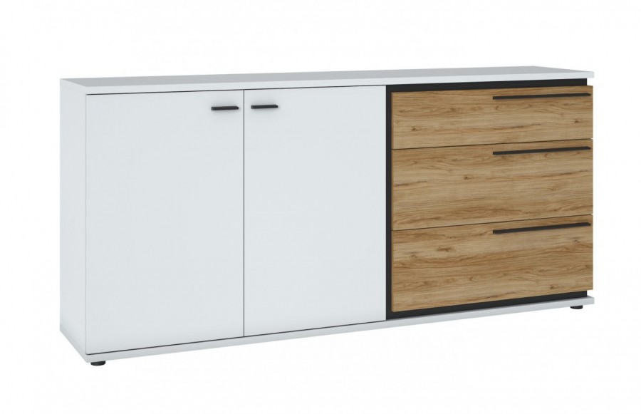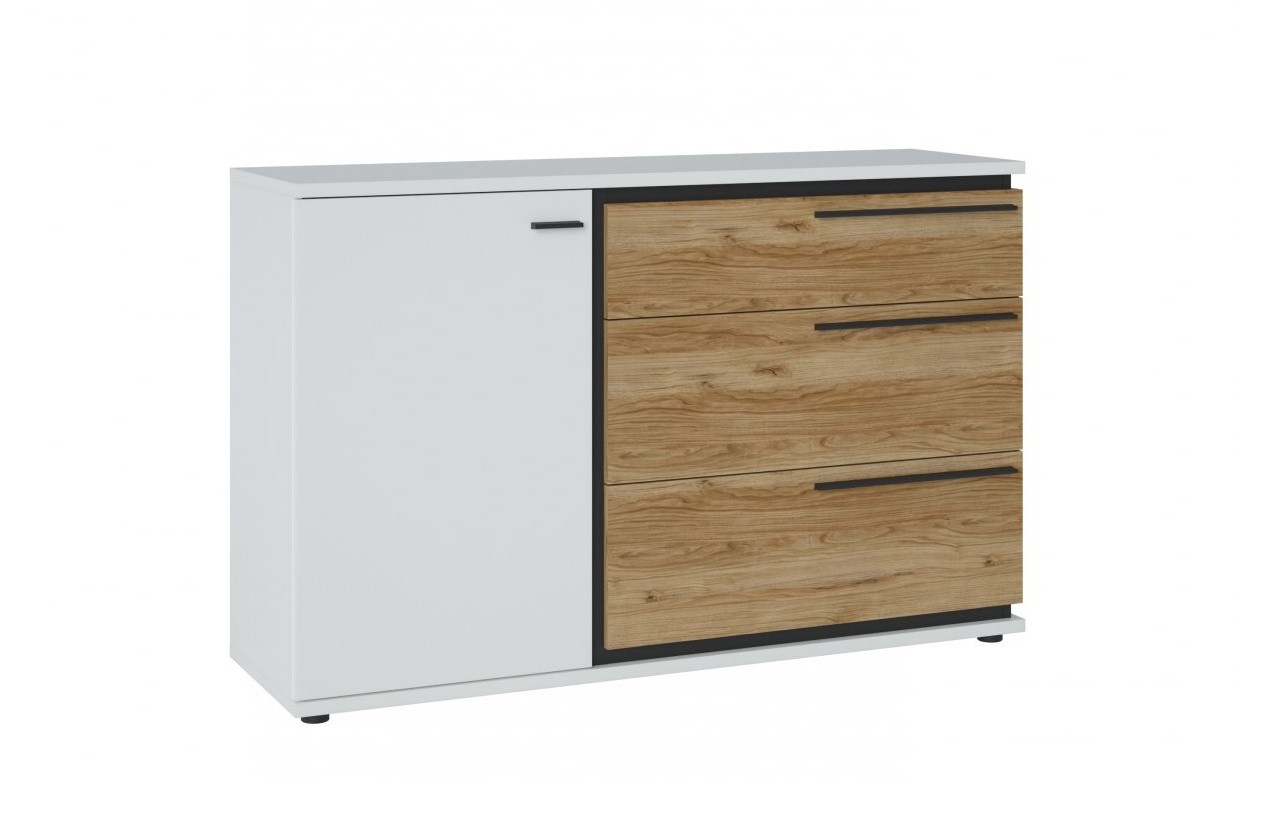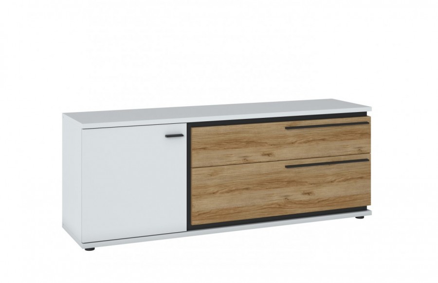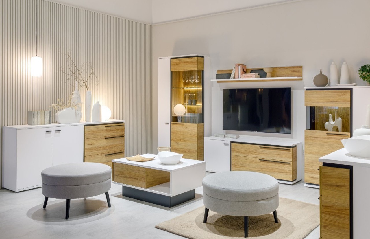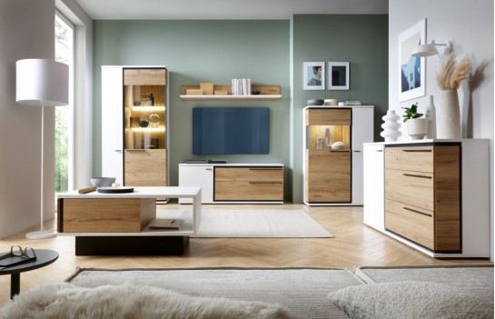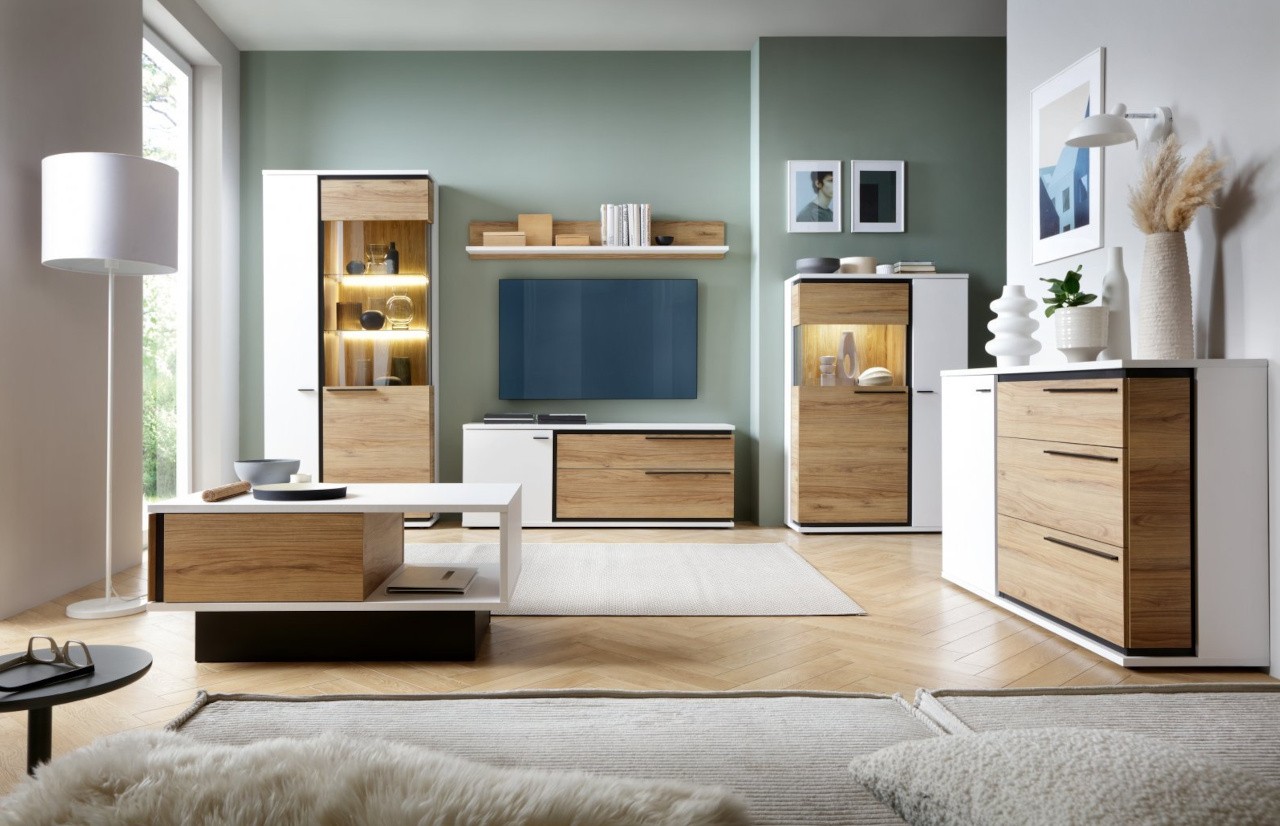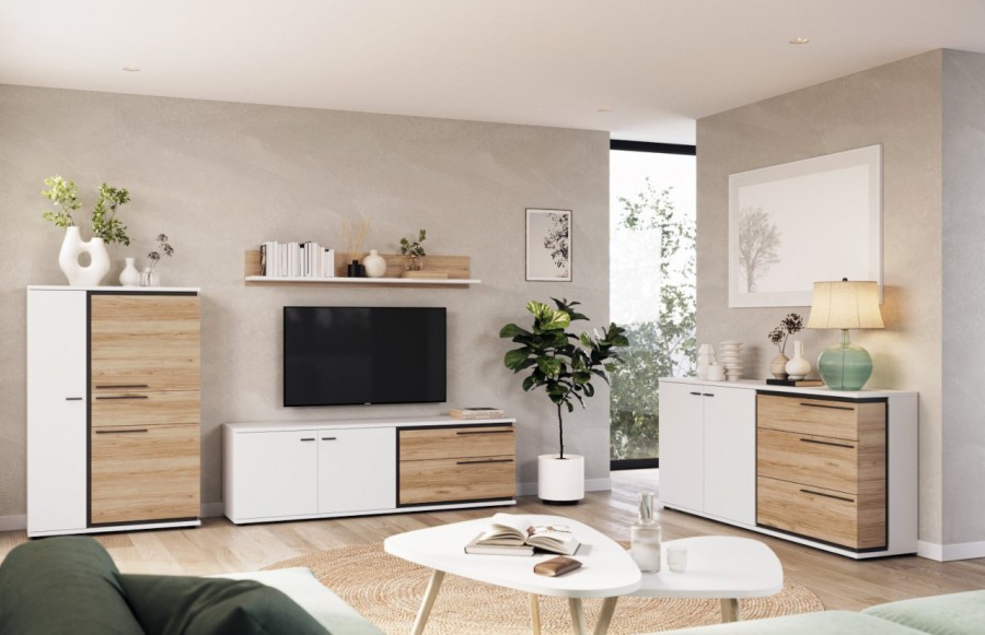 Kolekcja SALINAS - to nie tylko eleganckie meble do salonu, pokoju gościnnego i jadalni, ale także połączenie minimalistycznego stylu industrialnego z wyjątkową funkcjonalnością. Wykonane z laminowanej płyty wiórowej w kolorach matowej czerni i jasnej alpejskiej bieli, z frontami w bieli i ciepłym odcieniu dąb catania, zapewniają trwałość i odporność na codzienne użytkowanie. System cichego domyku w szufladach i drzwiach zapewnia wygodę użytkowania. Te nowoczesne meble idealnie komponują się z przestronnymi wnętrzami, nadając im elegancji i funkcjonalności. Bogata oferta obejmuje witryny, komody, szafki RTV, stoliki, stoły oraz półkę wiszącą, wszystkie w zestawieniu trzech kolorów: bieli alpejskiej, dębu Catani oraz czarnego matu. Odmień swój salon lub jadalnię, nadając im nowoczesny klimat i jednocześnie zyskując praktyczną i stylową przestrzeń na codzienne użytkowanie.