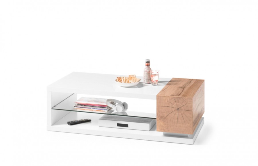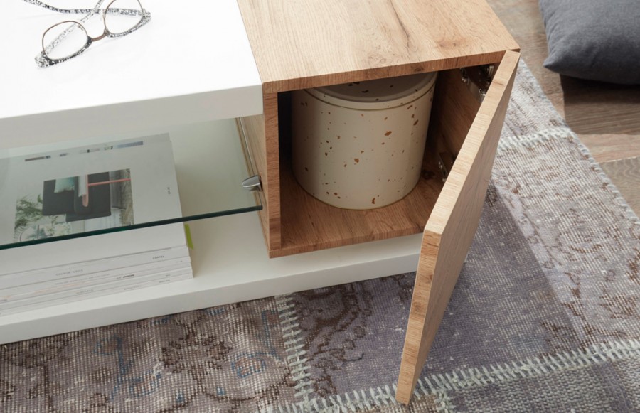 Ława MANISA - to praktyczny i nowoczesny mebel, który dodaje świeżości i atrakcyjności wnętrzu. Dostępny w połączeniu białego matu, szkła i imitacji drewna, pasuje do wielu aranżacji. Posiada szklaną półkę i szafkę, co pomaga utrzymać porządek. Idealny do wieczorów przed telewizorem i spotkań z przyjaciółmi, oferuje dużą powierzchnię do przechowywania.