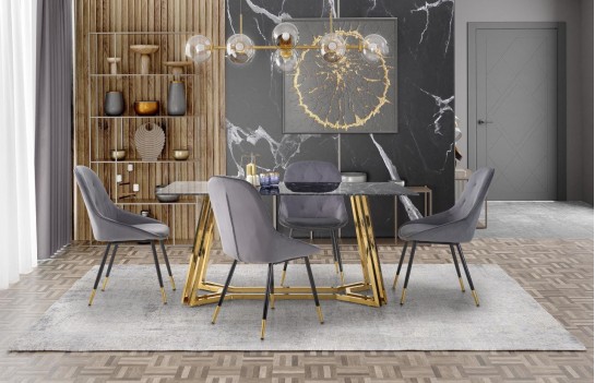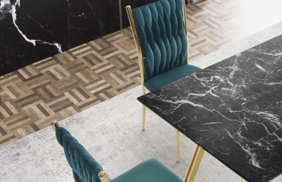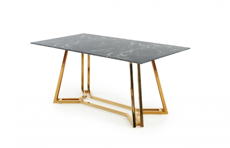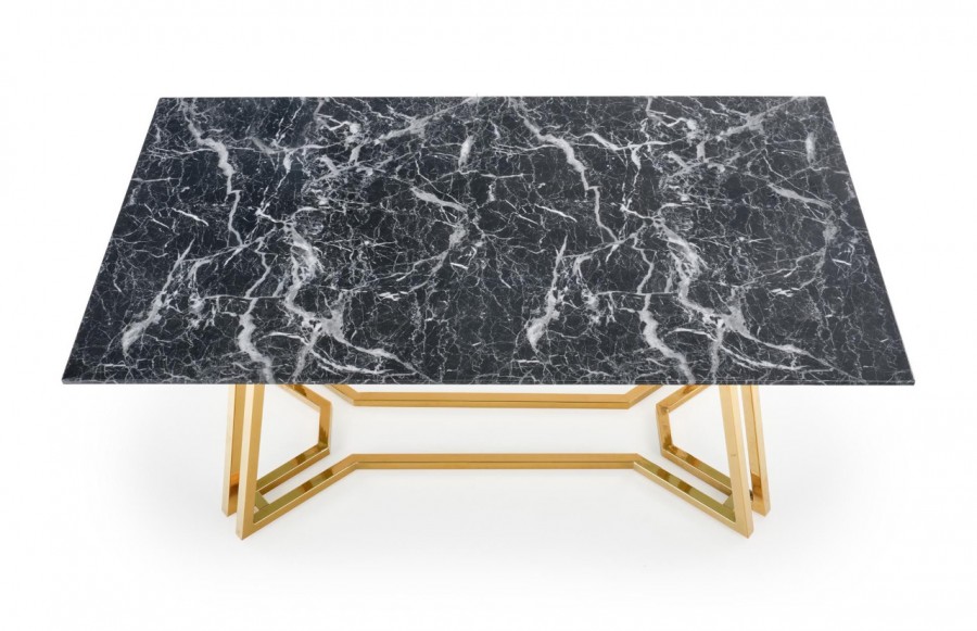 Stół KONAMI - nowoczesny stół w stylu glamour. Mebel posiada ozdobny stelaż ze stali chromowanej w urzekającym złotym kolorze, blat natomiast wykonany jest ze szkła transparentnego w kolorze czarny marmur. Dzięki zastosowaniu szkła i nowoczesnej formy podstawy, stół zachwyca swoim urokiem oraz przyciąga wzrok nawet najbardziej wymagających klientów. Całość prezentuje się bardzo elegancko. Stół Konami doskonale odnajdzie się we wnętrzach w stylu glamour.