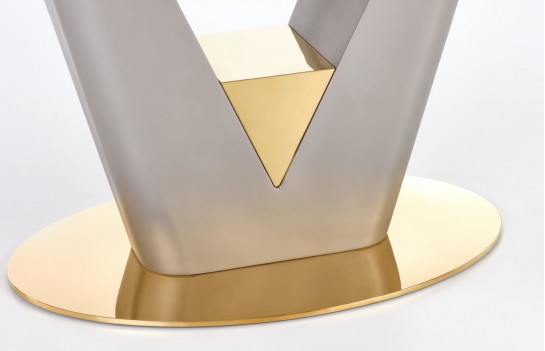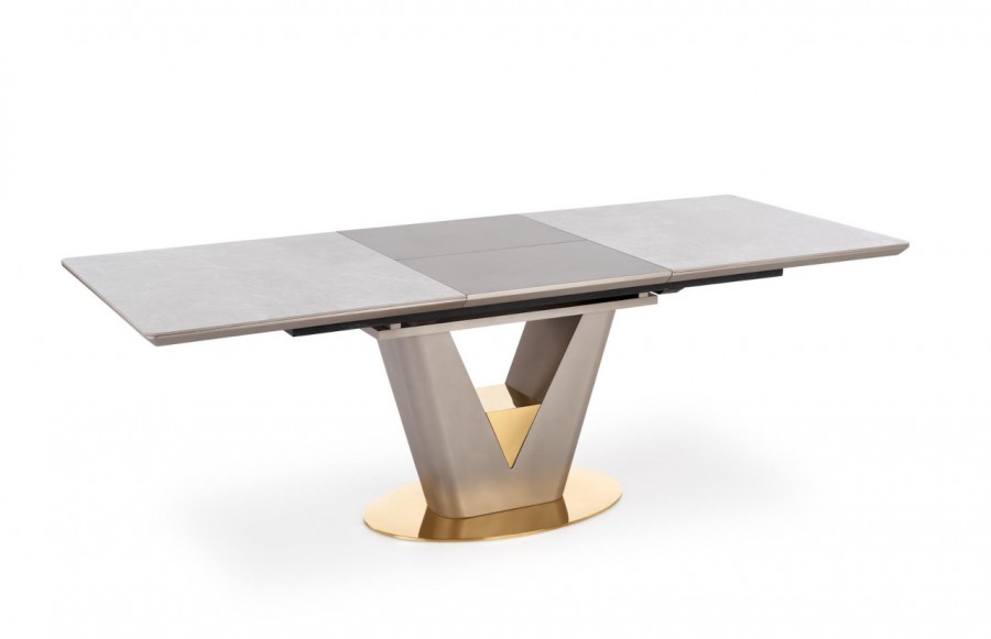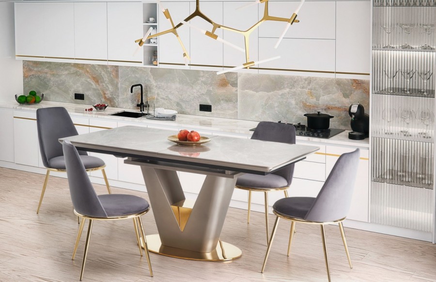 Stół VALENTINO - to wyjątkowo elegancki mebel, który przykuwa uwagę swoją stylową kolorystyką. Blat stołu wykonany z ceramiki w odcieniach popielatego marmuru jest trwały i odporny na codzienne użytkowanie. Podstawa stołu, lakierowana na jasno popielaty kolor, z chromowaną stalową podstawą w złotym odcieniu, nadaje mu wyjątkowego charakteru. Stół Valentino posiada funkcję rozkładania, umożliwiając powiększenie jego długości z 160 cm do aż 220 cm, co jest praktycznym rozwiązaniem podczas większych spotkań. Nietuzinkowy kształt stołu, przypominający literę V, wykonany z wysokiej jakości materiałów, nadaje mu unikalny wygląd. Valentino doskonale komponuje się z eleganckimi i nowoczesnymi wnętrzami, dodając szyku i ekskluzywnego wyrazu.
