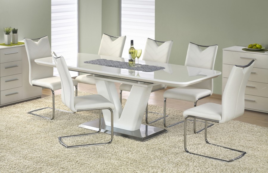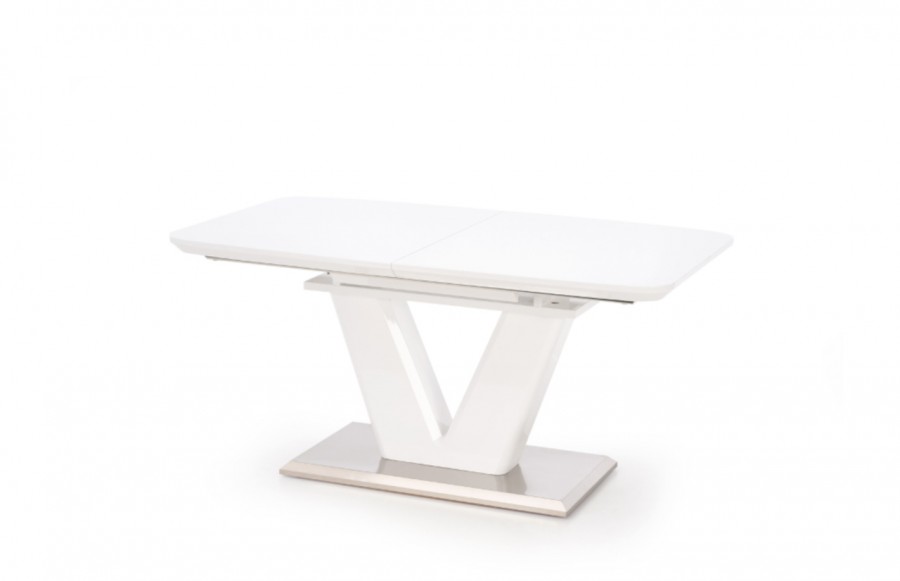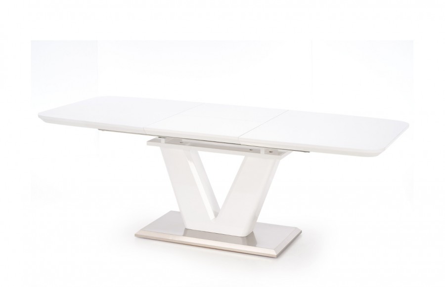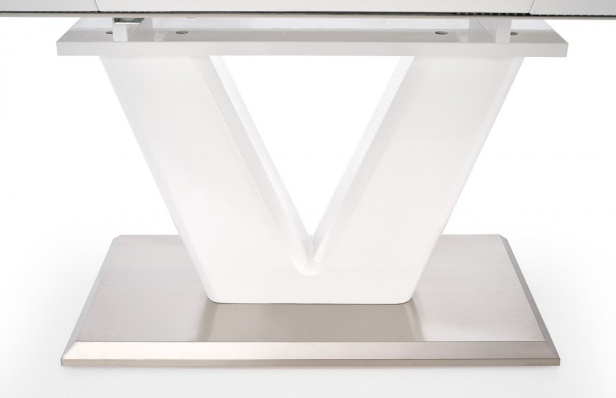 Stół MISTRAL - to idealna propozycja dla tych, którzy poszukują funkcjonalnego mebla o nowoczesnym designie. Jego unikalna podstawa w kształcie litery V łączy w sobie stal nierdzewną i lakierowaną płytę MDF, tworząc efektowny kontrast. Blat stołu nie tylko zachwyca swoim wyglądem, ale także jest łatwy w utrzymaniu czystości. Stół MISTRAL ma także możliwość regulacji długości, co sprawia, że doskonale sprawdzi się zarówno podczas kameralnych spotkań, jak i większych przyjęć. Jego wysoki połysk nawiązuje do stylu glamour, jednocześnie klasyczna linia nadaje się doskonale do wnętrz inspirowanych stylem modern. Stół MISTRAL to połączenie funkcjonalności, elegancji i nowoczesności, które z pewnością ozdobi każde wnętrze.