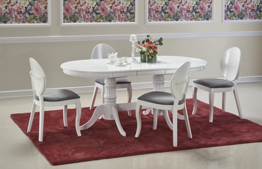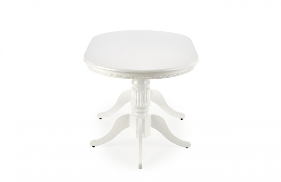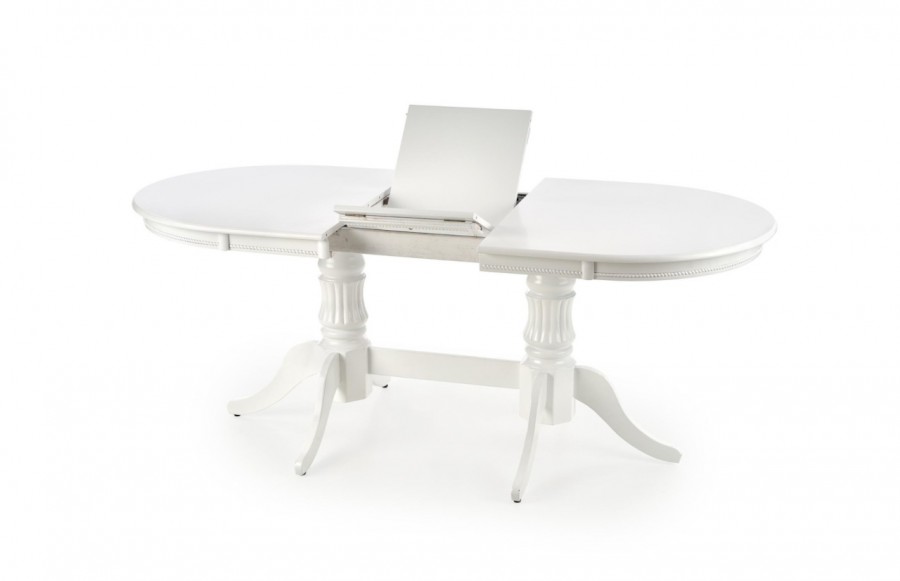 Stół JOSEPH - to połączenie klasycznej konstrukcji z ponadczasową estetyką, idealne rozwiązanie do przestrzeni stylizowanych. Ten rozkładany stół o wymiarach 150 × 90 cm można łatwo rozłożyć do powierzchni 190 × 90 cm. To propozycja dla wymagających użytkowników, którzy cenią zarówno praktyczność, jak i elegancki wygląd. Blat stołu ozdobiony delikatnymi zdobieniami wykonany jest z białej płyty MDF, co nadaje mu świeży i lekki wygląd. Dzięki temu stół doskonale sprawdzi się nawet w niewielkich przestrzeniach, dodając im przestrzenności i świeżości. Stylizowane nóżki stołu wykonane z litego drewna zakończone niewielkimi stopkami nie tylko dodają mu charakteru, ale także zapewniają stabilność i chronią podłogę przed zarysowaniami.