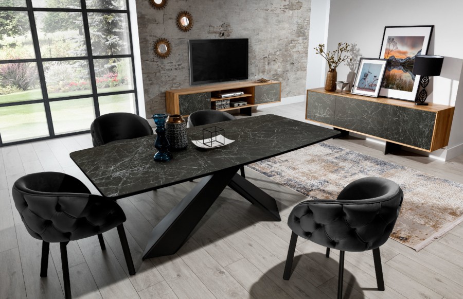 Stół LIVIO - innowacyjny stół LIVIO to połączenie nowoczesnego designu z wyrafinowanymi materiałami. Metalowy stelaż dostępny w czarnym lub grafitowym matowym wykończeniu nadaje mu niepowtarzalny charakter i zapewnia stabilność. Blat ze spieku kwarcowego w różnych kolorach oraz solidna podstawa nadają meblowi elegancję i wytrzymałość, która przyciąga uwagę gości.