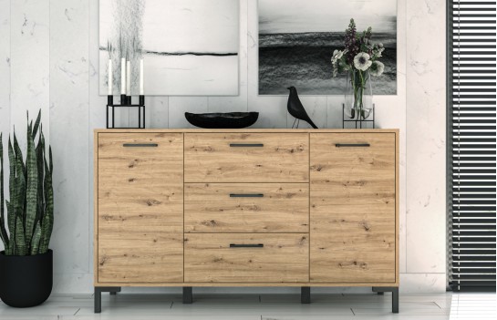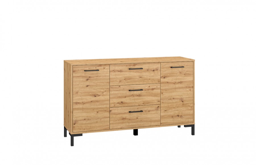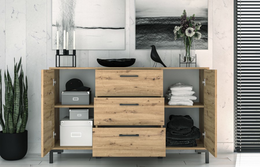 Komoda NEVIO 12 - to mebel, który łączy ciepłe odcienie drewna dębowego artisan z czarnymi akcentami, tworząc harmonijne połączenie. Ta komoda oferuje dużą ilość miejsca do przechowywania, dzięki dwóm półkom schowanym za parą drzwiczek oraz trzem pojemnym szufladom. Dzięki takiemu rozplanowaniu wnętrza, łatwo i wygodnie można przechowywać wiele potrzebnych rzeczy. Dodatkowo, komoda wyposażona jest w komfortowy system pełnego wysuwu szuflad, co pozwala na szybki i łatwy dostęp do ich zawartości. Komoda Nevio 12 to idealne rozwiązanie do wielu pomieszczeń, takich jak przedpokój, salon, pokój dzienny czy sypialnia. To elegancki i funkcjonalny mebel, który nada Twojemu wnętrzu wyjątkowy charakter.