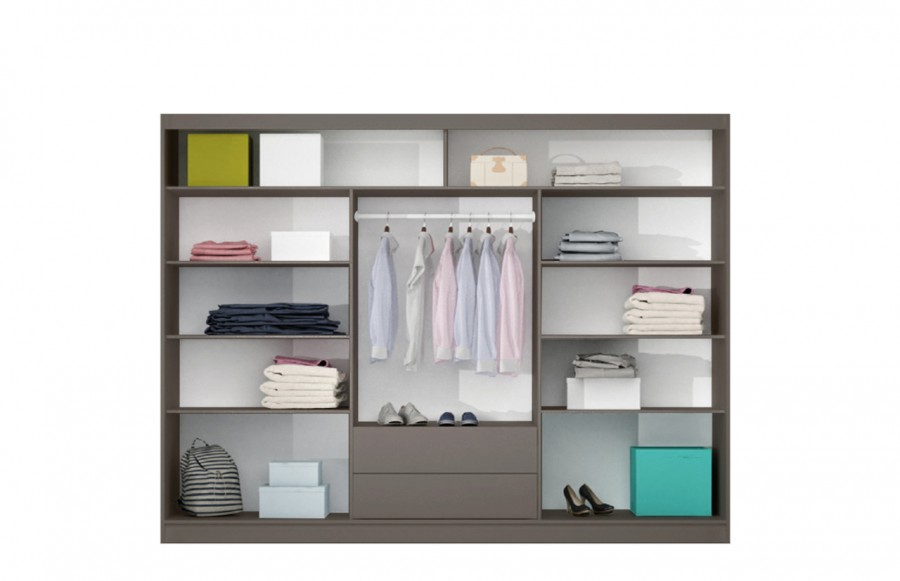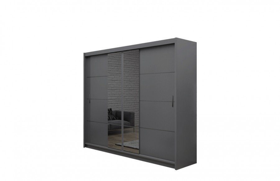 Szafa PORT II 250 - w szerokościach 203 i 250 cm to doskonałe rozwiązanie do sypialni, garderoby lub holu. Elegancki grafitowy kolor i lustrzane fronty nadają wnętrzu niepowtarzalnego uroku, zachowując funkcjonalność. Szafy wykonane z trwałej płyty meblowej laminowanej są łatwe w utrzymaniu czystości. Aluminiowe prowadnice drzwi zapewniają płynne otwieranie i zamykanie. Wnętrze zawiera drążki do ubrań, wiele półek oraz w wersji 250 cm praktyczne szuflady. PORTO II łączy nowoczesny design i funkcjonalność, tworząc stylową i uporządkowaną sypialnię.