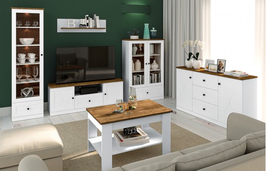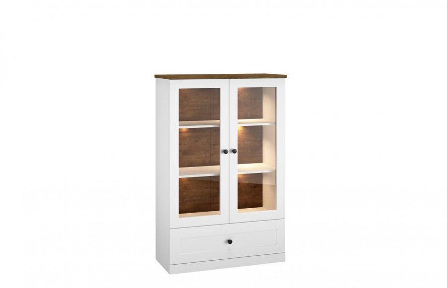Witryna LILLE 05 - to piękne meble o klasycznym białym wykończeniu, które przywołują ducha prowansalskiego stylu. Subtelne ornamenty na drzwiczkach dodają meblom szyku, a użycie wieńca górnego w kolorze dębu lefkas nadaje wnętrzu przytulności i ciepła. Stylowa i elegancka witryna dwudrzwiowa to idealny mebel do salonu, pokoju dziennego i jadalni. Doskonale eksponuje zarówno zastawę stołową i kieliszki, jak i książki, dekoracje czy ramki na zdjęcia, dodając uroku każdemu pomieszczeniu. Witryna wyposażona jest w oświetlenie, cichy domyk oraz pełne wysuwane szuflady z wzmocnionym dnem, co zwiększa ich ładowność. Kolekcja zawiera również kredensy z przeszklonymi górnymi szafkami oraz inne wolnostojące elementy, takie jak komody czy dodatkowe witryny.