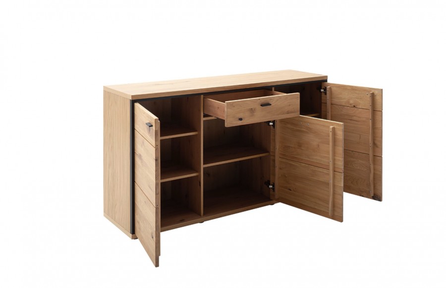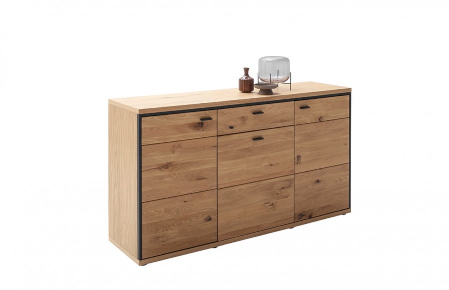 Komoda BARI - drewniana komoda w stylu klasycznym. Fronty wykonane są z litego drewna dębowego, to dąb sękaty olejowany w kolorze bianco. Natomiast korpus to okleina naturalna dębowa. Aplikacje dekoracyjne oraz uchwyty wykonane są z metalu w kolorze czarno-szarym. Wszystkie szuflady oraz drzwi komody Bari wyposażone są w cichy domyk. Dzięki klasycznej formie mebel wpasuje się niemal w każdą aranżację. To idealne rozwiązanie dla osób, które poszukują prostej, a zarazem funkcjonalnej komody.
