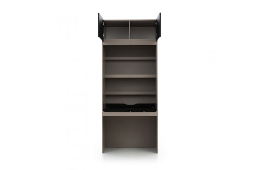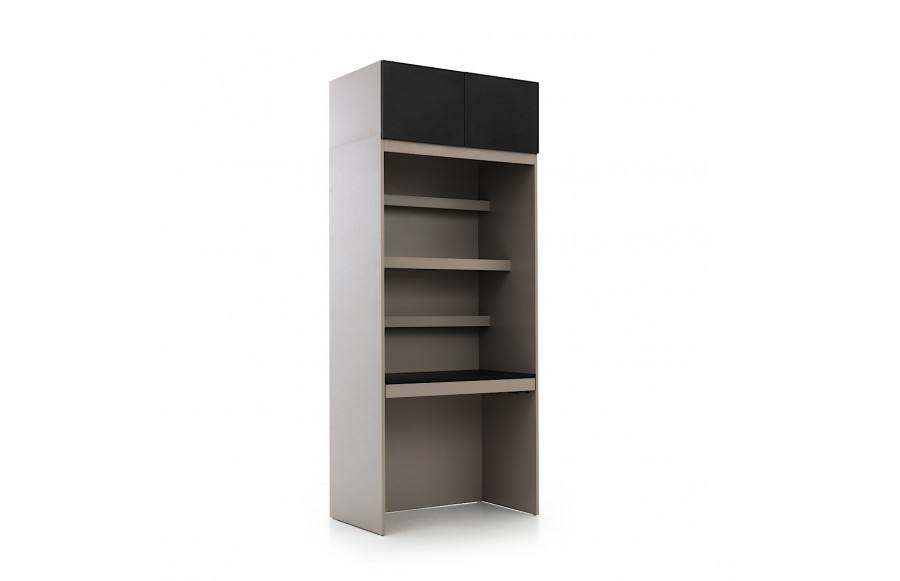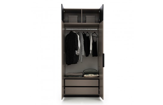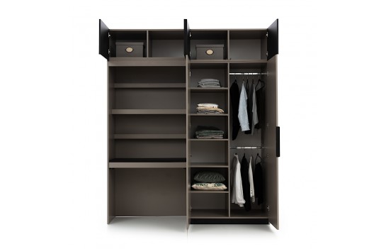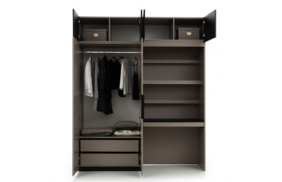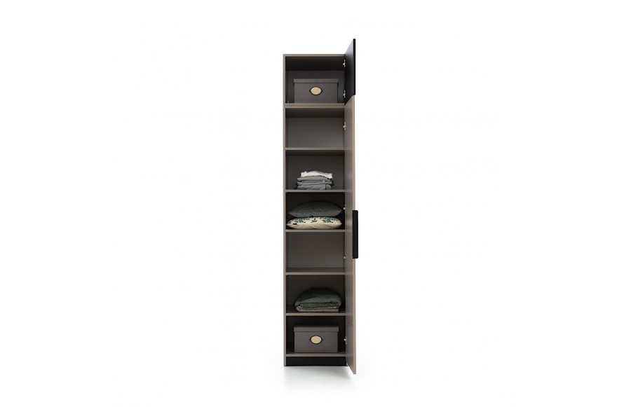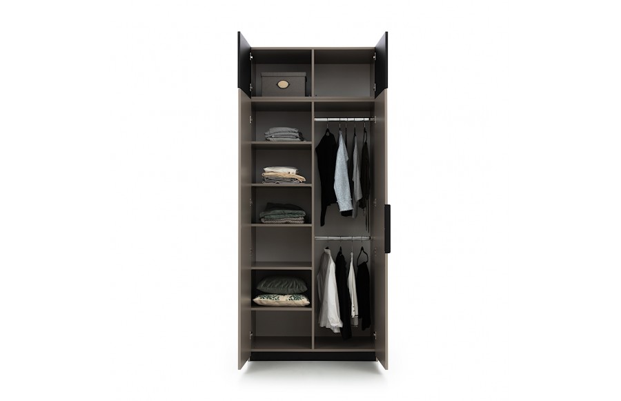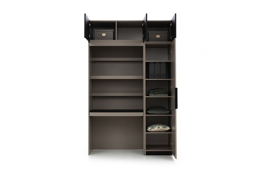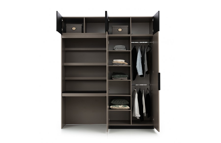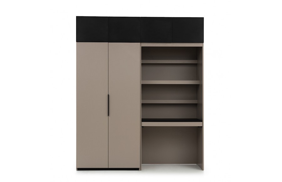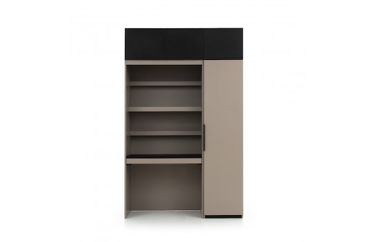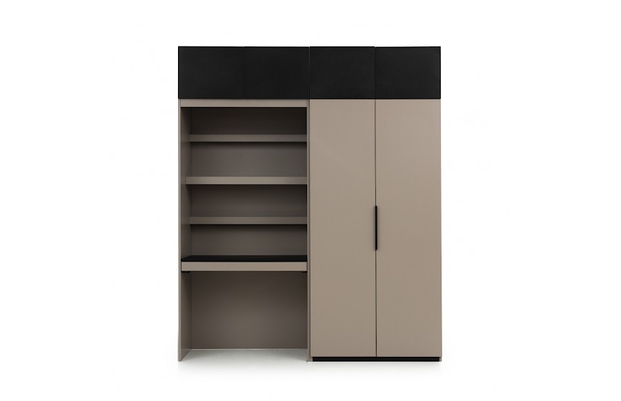 Sypialnia UFFICIO Z BIUREM - to wyjątkowy zestaw mebli do sypialni, który doskonale łączy nowoczesny design z funkcjonalnością, pozwalając na wygodne korzystanie, zarówno jako miejsce do pracy, jak i relaksu. Inspirujący kontrast między elegancką czernią a ciepłym beżem nadaje wnętrzu nowoczesności i stylowego charakteru. W skład zestawu wchodzą różnorodne elementy, które można dowolnie łączyć - wygodne i pojemne szafy dwu- i jednodrzwiowe z praktycznymi drążkami, półkami i szufladami, a także osobne nadstawki w czarnym kolorze oraz regał z biurkiem i oświetlonymi półkami. Funkcjonalność zestawu podkreśla również zamykany schowek na kable i ładowarki w blacie biurka oraz wygodna szuflada pod blatem z przegródkami na drobne przedmioty. Kolekcja UFFICIO to idealne rozwiązanie dla osób pracujących w domu, które nie mają osobnego gabinetu, ale potrzebują funkcjonalnego i eleganckiego miejsca do pracy. Oryginalny design i praktyczne rozwiązania sprawiają, że zestaw ten nie tylko spełnia potrzeby użytkowników, ale również nadaje wnętrzu wyjątkowego charakteru. Dodatkowo, minimalistyczne stoliki nocne w kształcie dwukolorowych prostych brył na czarnych drewnianych nogach idealnie komponują się z resztą kolekcji, tworząc spójną aranżację sypialni. Odkryj możliwości kolekcji UFFICIO i nadaj swojej przestrzeni elegancji i funkcjonalności.