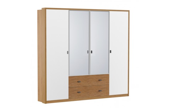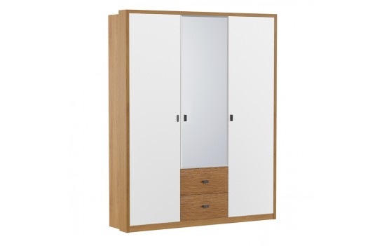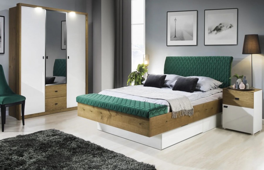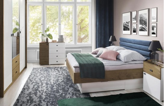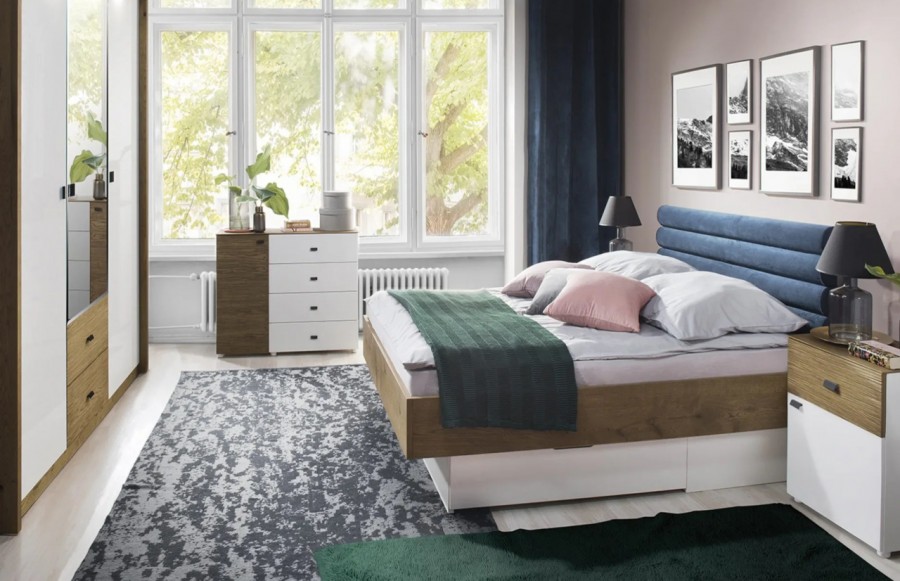 Sypialnia RIO - to harmonijne połączenie ciepłego odcienia naturalnej dębowej okleiny z nieskazitelną bielą, które doskonale wkomponuje się w każde wnętrze, dodając mu niepowtarzalnego uroku. Kontrastujące dekory dębu rio i głębokiej bieli tworzą niezwykłą atmosferę, która zachwyci Twoje zmysły. Kolekcja RIO to kompletny zestaw mebli, który doskonale zaaranżuje Twoją sypialnię, oferując różnorodne elementy, takie jak solidne i nowoczesne łóżka z tapicerowanym zagłówkiem, komody z szufladami oraz pojemne szafy w różnych konfiguracjach. Nietuzinkowa, ryflowana struktura elementów dębowych nadaje kolekcji RIO wyjątkowego charakteru, urozmaicając jej delikatny kontrast kolorystyczny. Solidne i nowoczesne łóżko z tapicerowanym zagłówkiem to kwintesencja klasyki i wysokiej jakości. Prosta rama łóżka połączona z tapicerowanym wezgłowiem prezentuje się elegancko i ekskluzywnie, dodatkowo oferując możliwość wyboru tkaniny spośród wielu kolorów, co pozwala dopasować mebel do preferencji klienta. Dodatkowym atutem są szuflady z obu stron łóżka w standardzie, zapewniające dodatkową przestrzeń do przechowywania. Sypialnia RIO to oaza przytulności, powrót do natury i maksymalnej użyteczności. Kolekcja RIO emanuje nowoczesnością oraz elegancją, pozostawiając trwałe wrażenie na użytkownikach.