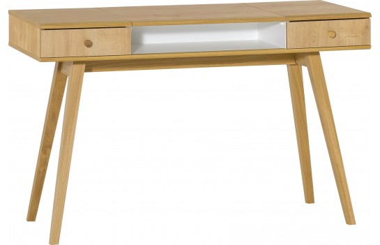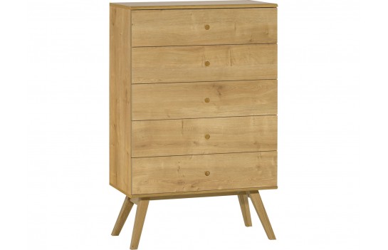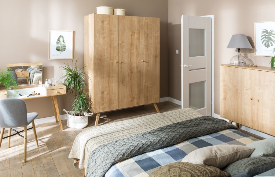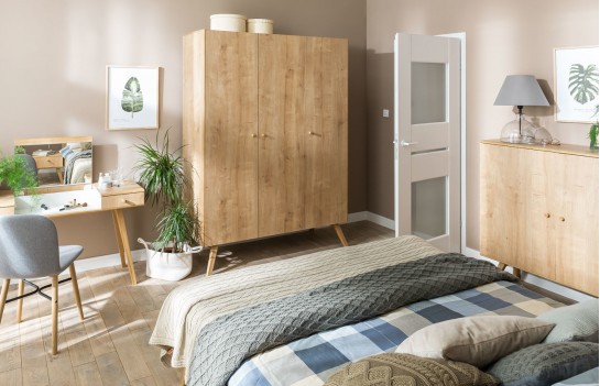 Sypialnia NATURE - emanuje zamiłowaniem do naturalnych materiałów i przekonaniem, że każda przestrzeń może być mądrze i pięknie wykorzystana. Ta rustykalna sypialnia to harmonijna mieszanka naturalnych materiałów, tradycyjnych technik rzemieślniczych i detali inspirowanych naturą. Łóżko z kolekcji NATURE występuje w dwóch wariantach: z pełnym i ażurowym zagłówkiem, wykonanym z litego drewna dębowego. Można je uzupełnić o szufladę w dekorze dębu lub kontrastującej bieli. Niezbędny stolik nocny o harmonijnych proporcjach jest również dostępny w kolekcji. Gdy sypialnia pełni funkcję garderoby, można ją wyposażyć w pojemną trzydrzwiową szafę z możliwością dopasowania wnętrza do potrzeb użytkownika. Komoda i regał doskonale pomieszczą drobne przedmioty, uzupełniając aranżację. Kamerdyner, wykonany z litego drewna, może służyć jako taboret lub kwietnik. Toaletka, z możliwością przekształcenia w biurko, jest kolejnym funkcjonalnym elementem kolekcji. Meble zastosowane w kolekcji NATURE łączą różne materiały, m.in. płyty laminowane, dwustronne płyty laminowane, zapewniające trwałość i odporność na zabrudzenia. Nogi i uchwyty mebli wykonane są ze szlachetnego drewna dębowego, dodając elegancji. Klient może wybierać między frontami w dekorze dębu lub kolorze białym. Kolekcja NATURE elastycznie dostosowuje się do różnych pomieszczeń, umożliwiając urządzenie zarówno salonu, jadalni, jak i sypialni.