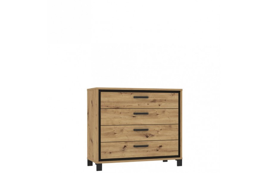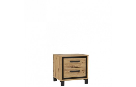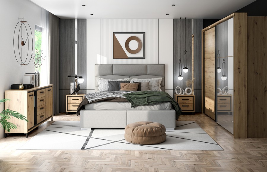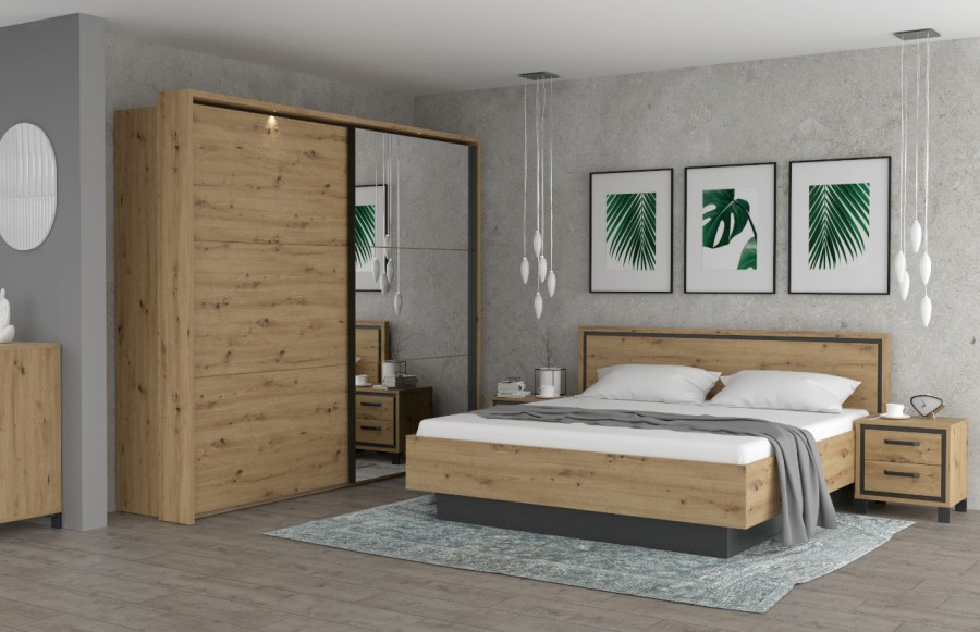 Sypialnia TRONDHEIM - to połączenie minimalizmu i surowości, które nadają wnętrzom elegancki i nowoczesny charakter. Tradycyjny Dąb Artisan przełamany wstawkami w dekorze Czarnego Dębu tworzy unikatową atmosferę, idealną dla miłośników prostoty. System mebli TRONDHEIM został wyposażony w praktyczne rozwiązania, takie jak hamulec w drzwiczkach szafek i efektowne metalowe uchwyty, podkreślające linię mebli. Dodatkowo, nastrojowe oświetlenie, ukryte za hartowanym szkłem, nadaje kolekcji niepowtarzalnego klimatu. Wybierając stelaż łóżka TRONDHEIM, dodasz wyjątkowego charakteru swojej sypialni w stylu modern loft. Zestawienie dekoru Dębu Artisan z ciemnym kolorem imitującym drewno zapewni niezapomniane chwile relaksu. Połącz stelaż z innymi elementami kolekcji TRONDHEIM, aby stworzyć funkcjonalną i stylową przestrzeń sypialni, w której każdy moment będzie wyjątkowy. Praktyczne rozwiązania, takie jak pojemna szafa, ułatwiają organizację przestrzeni, a elastyczność konfiguracji kolekcji TRONDHEIM pozwala idealnie dostosować meble do wymiarów i kształtu pomieszczenia. Szafa TRONDHEIM to imponujący mebel o eleganckim i nowoczesnym charakterze. Wyposażona w wygodne przesuwne drzwi, trzy drążki do wieszania ubrań oraz trzy górne półki, zapewnia dużo miejsca do przechowywania odzieży i innych przedmiotów. Oryginalne metalowe uchwyty w kolorze czarnego matu stanowią idealne uzupełnienie aranżacji sypialni. Szafki nocne, komody oraz krzesła dopełniają kompletną aranżację sypialni, zapewniając miejsce na przechowywanie i funkcjonalność, jednocześnie zachowując spójny styl. Dzięki kolekcji TRONDHEIM stworzysz swoją własną, prywatną oazę spokoju, w której każdy spędzony moment będzie wyjątkowy. Minimalistyczny, a zarazem elegancki wygląd mebli nadaje pomieszczeniu nowoczesny charakter, a funkcjonalne rozwiązania ułatwiają codzienne życie.