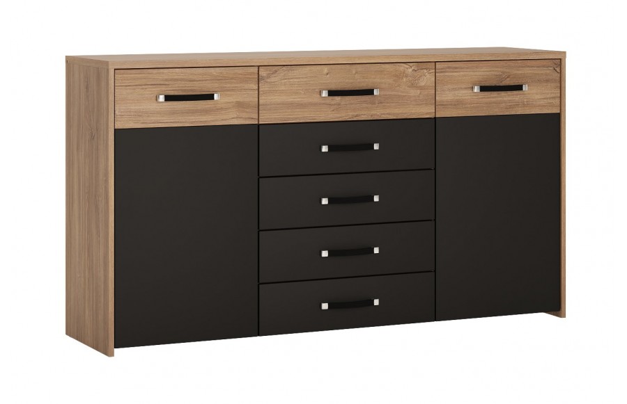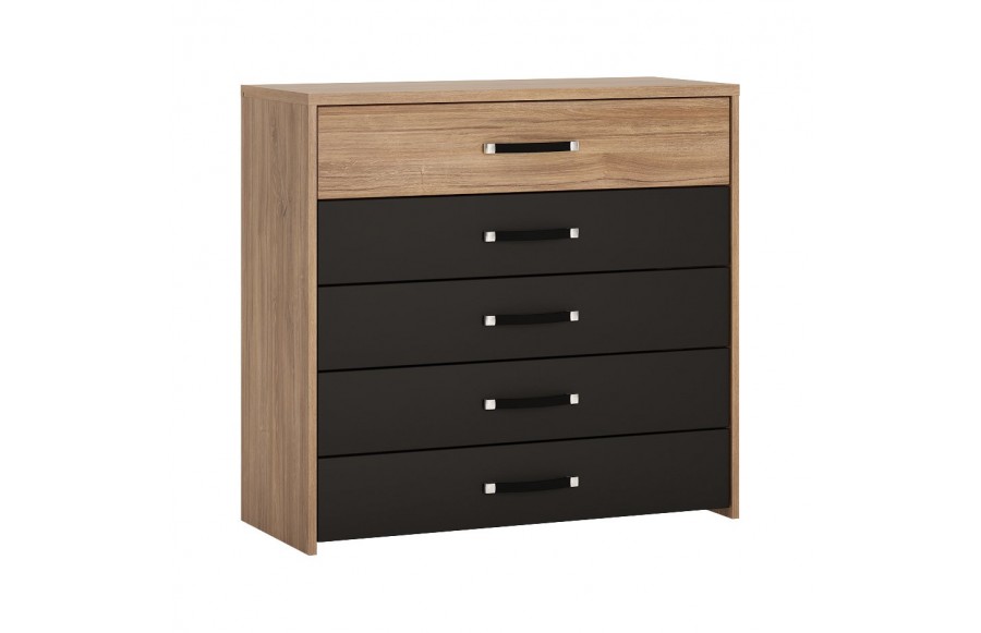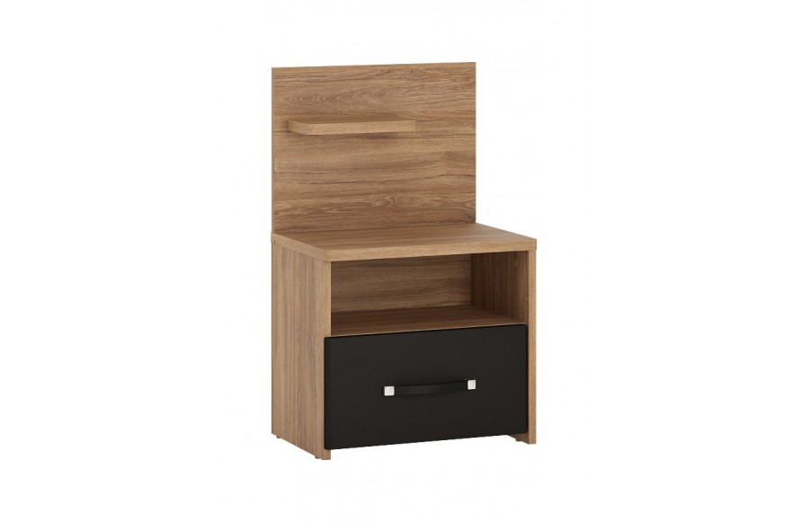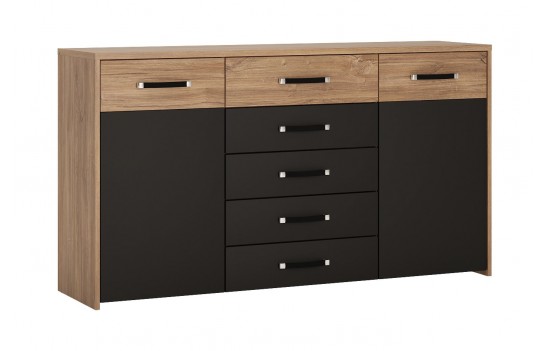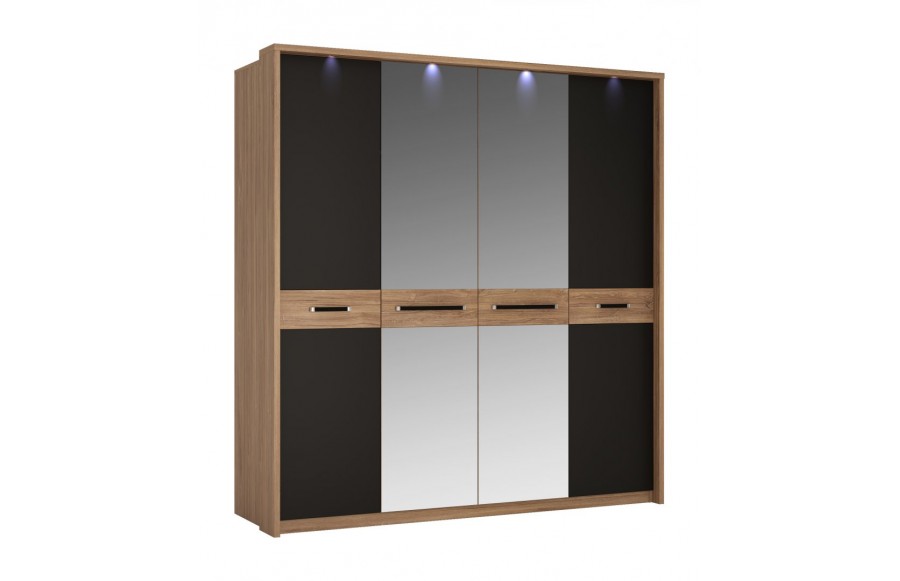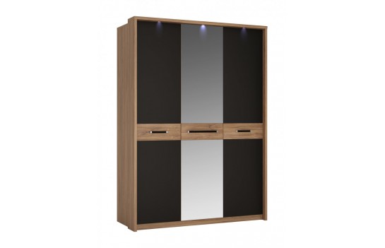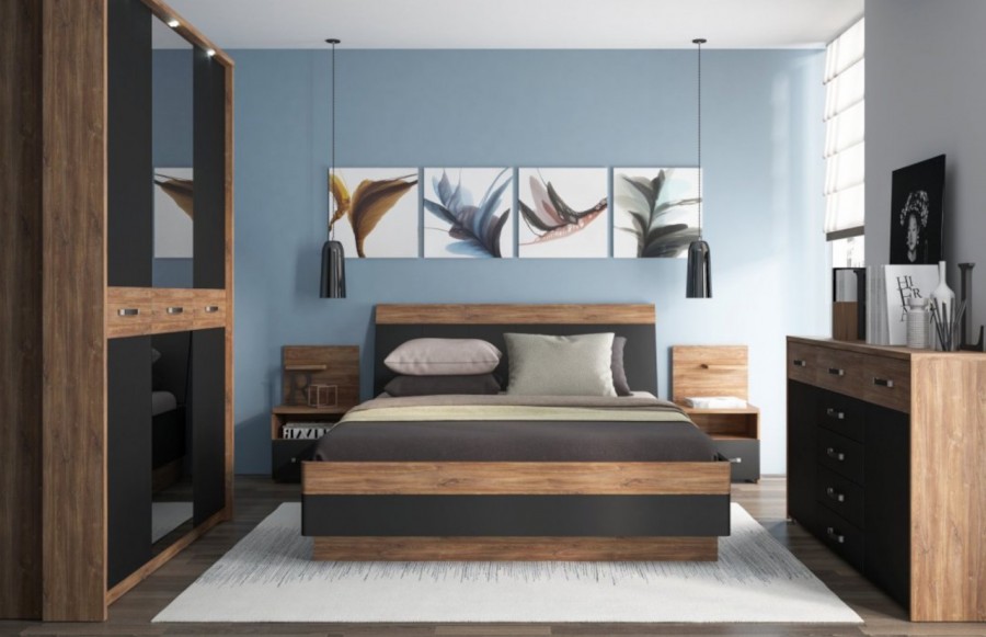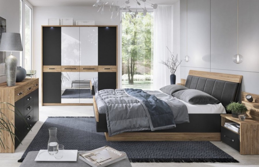 Sypialnia MONACO - to wyrafinowane meble stworzone z myślą o aranżacji sypialni. Wykonane z najwyższej jakości płyty laminowanej i MDF, cechują się one wyjątkową odpornością na wilgoć, zarysowania i wysoką temperaturę. System został dopracowany w najdrobniejszych szczegółach, a jego wysoka jakość wykonania gwarantuje trwałość na lata. Zawiasy drzwi oraz prowadnice szuflad zostały wyposażone w system cichego domykania, co zapewnia wygodę użytkowania. Połączenie dekoru Dąb Stirling z czarnym matem i metalowymi uchwytami nadaje wnętrzu wyjątkowej elegancji. Szczególne elementy, takie jak tapicerowane wezgłowie łóżka, pojemna szafa z podświetlanym drążkiem i lustrem oraz funkcjonalne szafki nocne, sprawiają, że kolekcja MONACO spełni nawet najśmielsze oczekiwania co do idealnej sypialni. Eleganckie łóżko dla dwojga, wyposażone w wysokie, tapicerowane wezgłowie, zapewni komfortowe chwile zarówno podczas porannej kawy, jak i wieczornej lektury przed zaśnięciem. Dodatkowo, łóżko zostało wyposażone w pojemniki na pościel pod całą powierzchnią spania oraz specjalne podnośniki gazowe, co sprawia, że stelaż jest bezpieczny i łatwy w użytkowaniu. Możliwość podświetlenia ramy łóżka za pomocą paska LED dodaje romantycznego nastroju do sypialni. Szafa MONACO to z kolei przestrzenne rozwiązanie na Twoją garderobę, wyposażone w starannie zaprojektowane wnętrze z dużą ilością półek, wieszaków i wnęk, by utrzymać porządek w Twojej garderobie. Lustrzane fronty optycznie powiększają sypialnię, a nowoczesne uchwyty dodają elegancji. Łącząc łóżko z szafkami nocnymi, komodą i szafą z kolekcji MONACO, możesz cieszyć się komfortem i elegancją każdego dnia. Głęboka czerń, charakterystyczna dla tej kolekcji, zachwyci miłośników oryginalnych trendów wzorniczych, nawiązujących do najwyższej klasy i elegancji.