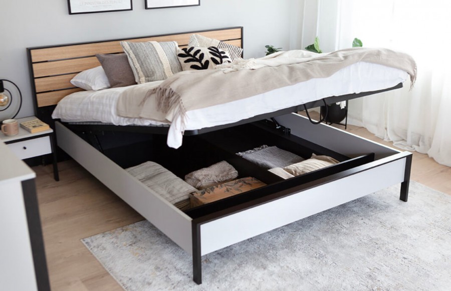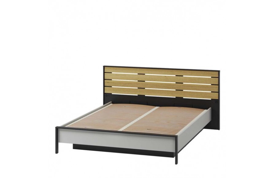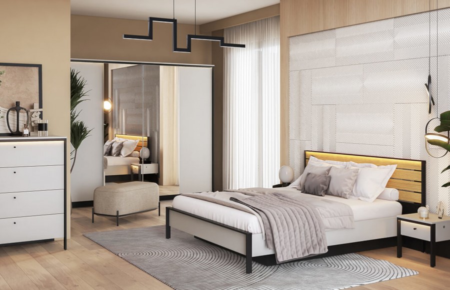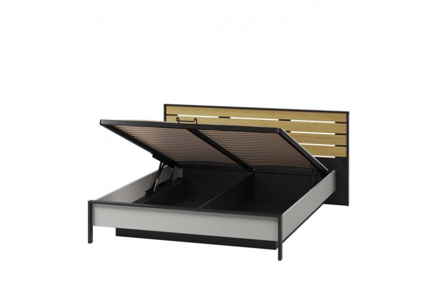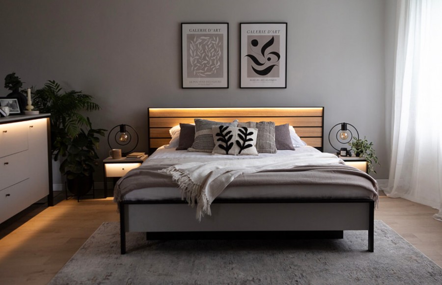 Sypialnia GRIS - odkryj magiczną atmosferę szarości z kolekcją mebli do sypialni GRIS. To miejsce, gdzie elegancja łączy się z funkcjonalnością, tworząc niepowtarzalny charakter Twojego wnętrza. Subtelny odcień szarości w połączeniu z czarnymi detalami nadaje sypialni wyrazistego charakteru. Meble z tej kolekcji nie tylko dodadzą uroku Twojemu wnętrzu, ale także zapewnią idealne miejsce do relaksu i wypoczynku po długim dniu. Kolekcja GRIS to połączenie nowoczesnego designu z funkcjonalnością i elegancją. Kolorystyka w odcieniach szaro-czarnych oraz dębu natura nadają pomieszczeniu wyjątkowego charakteru, tworząc przyjemne i stylowe wnętrze. GRIS to kompletny zestaw mebli, który zapewni Ci idealne miejsce do przechowywania i relaksu. Znajdziesz w nim pojemną szafę z lustrem, łóżko o dwóch powierzchniach spania, stoliki nocne oraz dwie komody z szufladami. Wszystkie elementy zostały zaprojektowane z myślą o funkcjonalności i estetyce, aby stworzyć idealne miejsce do wypoczynku. Łóżko GRIS to połączenie nowoczesnego designu z funkcjonalnością. Dostępne w dwóch rozmiarach i kolorach, z zagłówkiem w odcieniu dębu natura, wyposażone jest w pojemnik na pościel oraz dwa porty USB i port USB-C, zapewniając ładowanie urządzeń elektronicznych bez wychodzenia z łóżka. Dodatkowo, łóżko zostało zaprojektowane z dbałością o szczegóły, dzięki czemu prezentuje się niezwykle lekko, a cofnięta skrzynia zapewnia dodatkową przestrzeń do przechowywania rzeczy sezonowych. Wszystkie bryły z kolekcji są wyposażone w oświetlenie LED o ciepłej barwie, tworząc klimatyczny nastrój w sypialni. Odkryj kolekcję GRIS i stwórz wymarzoną sypialnię, która będzie idealnym miejscem relaksu i wypoczynku.