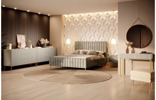 Sypialnia NICOLE - łóżko NICOLE to wyjątkowa mieszanka doskonałego gustu i nowoczesnej formy. To mebel, który doskonale wkomponuje się w modernistyczne wnętrza, dodając im estetycznego wyrafinowania oraz subtelnej finezji. Tapicerka wezgłowia, utrzymana w charakterystycznym kształcie kolekcji, nadaje całemu łóżku modny i awangardowy charakter. Wysokie, starannie wykonane przeszycia to jeden z głównych atutów wizualnych tego mebla. Łóżko NICOLE jest dostępne w kilku rozmiarach: 140, 160 oraz 180 cm. Stylowe, wysokie nóżki zostały tak zaprojektowane, aby umożliwić płynne poruszanie się robota sprzątającego, zachowując przy tym jednocześnie estetyczny wygląd. Dzięki szerokiej gamie kolorystycznej tkanin obiciowych, masz możliwość dostosowania wyglądu łóżka do swoich indywidualnych preferencji. To mebel, który nie tylko oferuje komfort w czasie głębokiego snu, ale również jest znakomitym elementem dekoracyjnym. Łóżko NICOLE, podobnie jak pozostałe meble z kolekcji, wyróżnia się prostym, geometrycznym kształtem. Doskonale komponuje się z innymi elementami kolekcji, takimi jak szafki nocne, komody, toaletka i kredens. Takie kompleksowe podejście pozwala na stworzenie spójnej, nowoczesnej i stylowej przestrzeni.