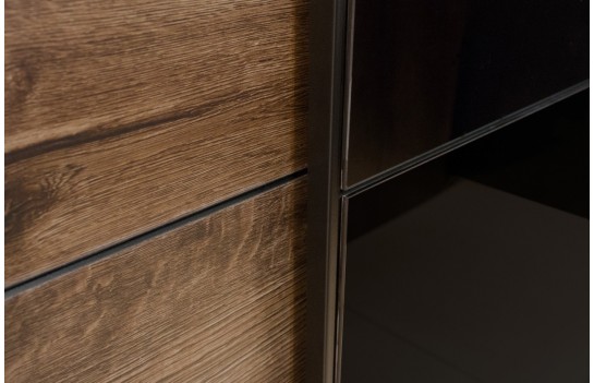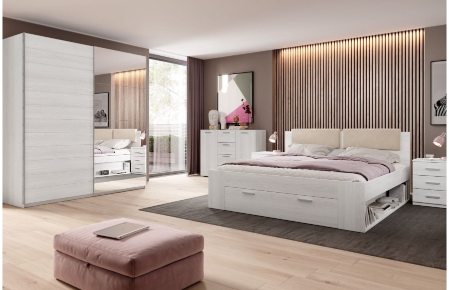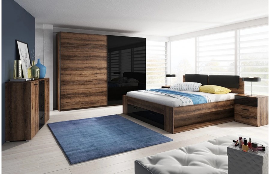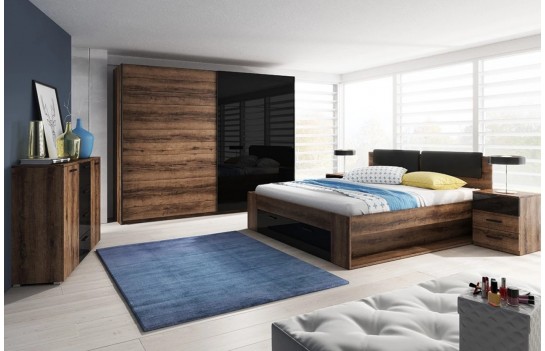Sypialnia GALAXY - to modna propozycja oparta na najnowszych trendach wnętrzarskich. GALAXY to sypialnia, która wyróżnia się awangardowym połączeniem ciemnego dębu z czarną, połyskującą powierzchnią. Dla miłośników klasycznej palety kolorów, polecamy wybarwienie w odcieniu bieli (abisko ash). Łoże Galaxy to nie tylko mebel, to prawdziwa ozdoba Twojej sypialni, która wpisuje się w najświeższe trendy. Kolekcja GALAXY to jednak nie tylko estetyka - to także innowacyjne i praktyczne rozwiązania, które maksymalnie wykorzystają przestrzeń Twojego wnętrza. Pojemna szuflada wbudowana w bryłę łóżka pozwoli Ci na przechowywanie pościeli i ubrań w zasięgu ręki. Zagłówek łóżka to nie tylko element dekoracyjny, ale także wsparcie dla Twojego kręgosłupa oraz komfort podczas czytania czy oglądania telewizji. To miejsce, gdzie komfort i funkcjonalność idą w parze. Łóżko Galaxy to tylko początek. Dopasuj swoje wnętrze, wybierając szafy o różnych rozmiarach: 200, 221 lub 270 cm. Dodatkowo, możesz wybrać stoliki nocne oraz komodę, tworząc spójną i funkcjonalną aranżację.
