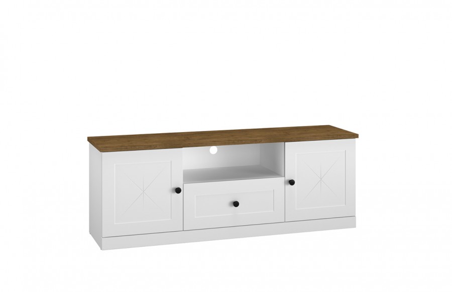 Szafka RTV LILLE 09 - to połączenie funkcjonalności i elegancji, które przyciąga uwagę od pierwszego spojrzenia. Jej minimalistyczna bryła w białym wykończeniu emanuje nowoczesnym stylem. Subtelne zdobienia na frontach i dębowy blat w odcieniu Lefkas dodają meblowi wyrafinowanego wyglądu. To mebel, który nie tylko pięknie wygląda, ale również jest bardzo praktyczny. Posiada praktyczną szufladę i dwie zamykane wnęki z wewnętrznymi półkami, idealne do przechowywania akcesoriów RTV i innych drobnych przedmiotów. Dodatkowo, otwarta półka pozwala na umieszczenie dekodera lub konsoli do gier, co zwiększa dostępną przestrzeń na blacie. To rozwiązanie, które pozwoli uporządkować przestrzeń i doda elegancji Twojemu wnętrzu.