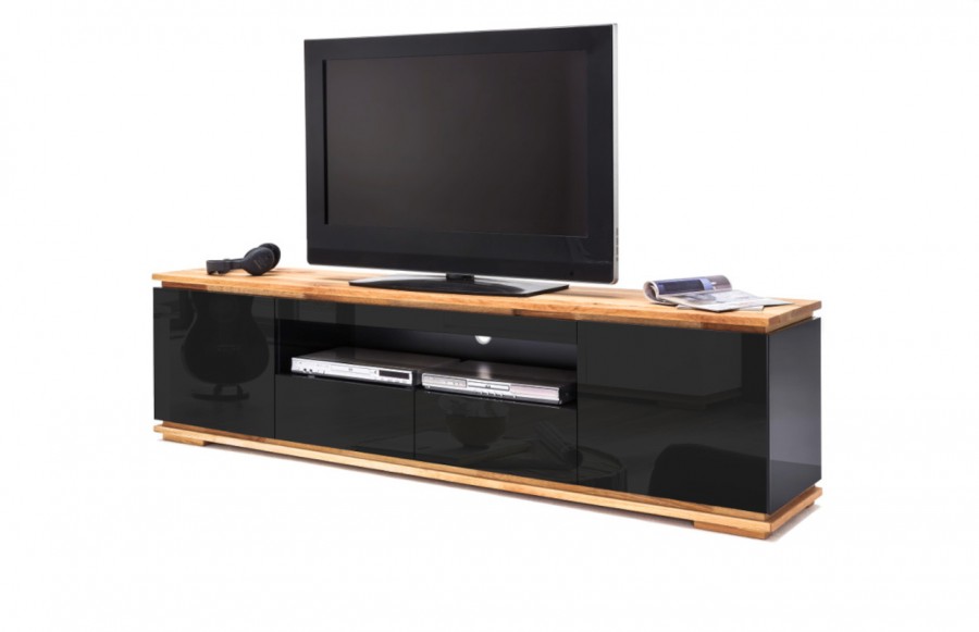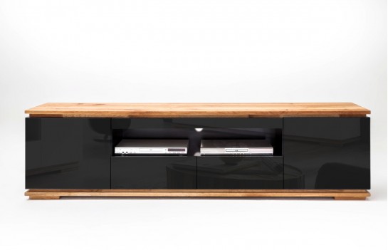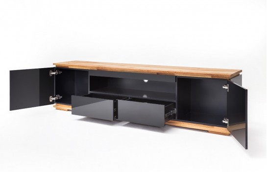 Szafka RTV CHIARO - elegancka i nowoczesna szafka RTV. Blat i podstawa to drewno dębowe sękate ze spękaniami, olejowane. Natomiast korpus i fronty to lakier czarny połysk. Szafka RTV wykończona jest w wysokim standardzie, zastosowano tutaj drzwi zewnętrze z cichym domykiem oraz szuflady na prowadnicach kulkowych, również z domykiem. Występuje w dwóch wersjach kolorystycznych: lakier czarny połysk i lakier biały mat. Szafka RTV CHIARO to idealny mebel do klasycznych wnętrz w eleganckim stylu.