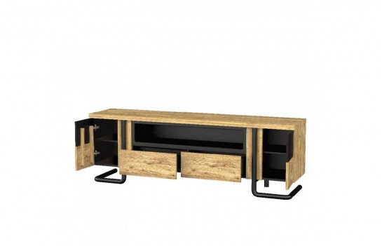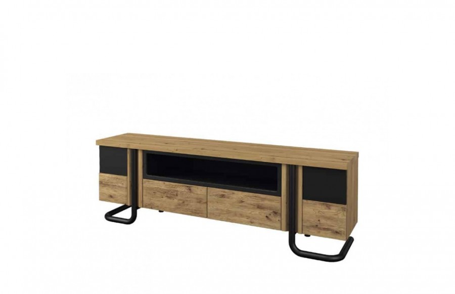 Szafka RTV OMEGA MAXI - to niezwykłe połączenie naturalnych materiałów takich jak drewno, skóra naturalna oraz metal. Fronty szafki RTV wykonane zostały z drewna dzikiego dębu z doskonale uwidocznionym usłojeniem. Dodatkowo zostały one wzbogacone czarnymi aplikacjami ze skóry naturalnej, które nadają bryle niepowtarzalnego charakteru oraz elegancji. Gięte, stalowe elementy doskonale podkreślają industrialny charakter kolekcji. Szafka RTV OMEGA stanowi wyjątkowe uzupełnienie mebli w salonie zapewniając dużą przestrzeń do przechowywania. Całość kolekcji cechuje minimalizm, funkcjonalność oraz wysoka jakość materiałów. W meblach OMEGA zastosowano nowoczesne rozwiązania - takie jak oświetlenie LED z włącznikiem bezdotykowym oraz system otwierania drzwi push to open.