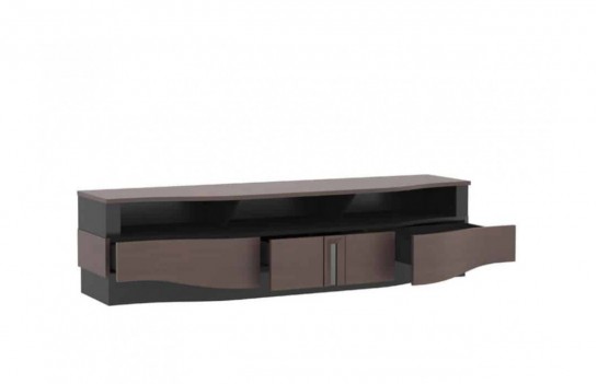 Szafka RTV DIUNA MAXI - to mebel, który łączy w sobie prostotę, elegancję oraz oryginalny design. Miękka i subtelna linia wzornicza, nawiązująca do motywu fali, tworzy efekt łagodnych kształtów i płynnych przejść. Fronty w eleganckim odcieniu wenge i lśniąca lakierowana czerń tworzą harmonijną całość. Wyposażona w trzy obszerne szuflady, jest idealnym rozwiązaniem do przechowywania wszelkich drobiazgów i akcesoriów RTV. Dzięki innowacyjnemu systemowi otwierania drzwi "push-to-open", korzystanie z tego mebla staje się niezwykle wygodne i intuicyjne. Dodatkowo, szafka posiada dwie przestronne wnęki pod blatem, które doskonale sprawdzą się do przechowywania odtwarzacza lub innych urządzeń elektronicznych. To mebel, który łączy w sobie funkcjonalność i nowoczesny design, doskonale pasujący do współczesnych wnętrz.
