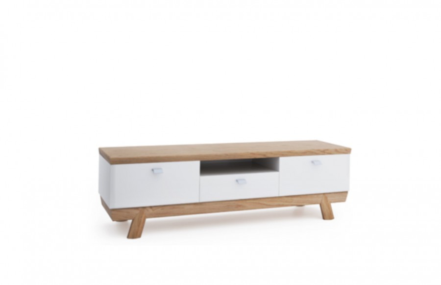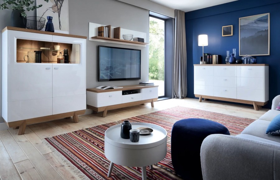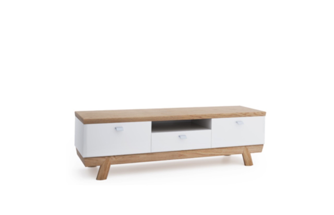 Szafka RTV ASPEN - to bryła gdzie nowoczesność spotyka elegancję poprzez harmonijne zestawienie drewna z białym połyskiem. Jej fronty, wyposażone w cichy domyk zapewniają płynne i bezgłośne zamykanie drzwiczek. W środkowej części szafki znajduje się pojemna szuflada z mechanizmem dociągu oraz wnęka na odtwarzacz. Szafka ASPEN to nie tylko praktyczny mebel do przechowywania, ale także element dekoracyjny, który wzbogaci wystrój każdego pomieszczenia. Dzięki dużej ilości brył, meble tej kolekcji zaaranżujemy do każdego wnętrza, zarówno jadalni, sypialni, czy też pokoju dziennego.