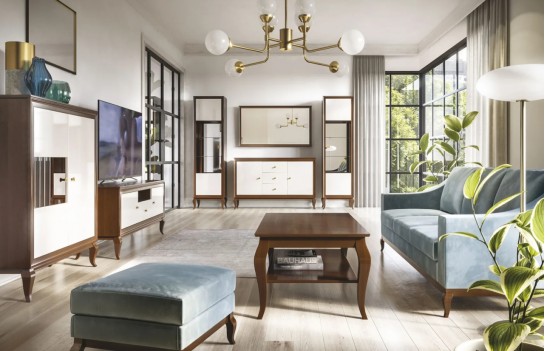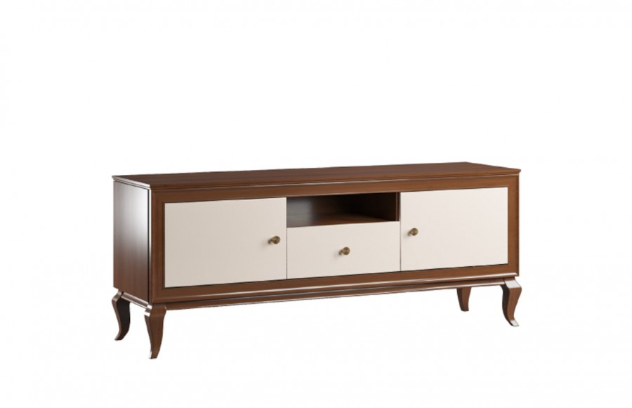 Szafka RTV NICEA - to elegancki i niezwykle funkcjonalny mebel, który doskonale uzupełni aranżację różnych wnętrz. Ten wyjątkowy mebel wyróżnia się prostą formą, smukłymi nóżkami oraz oryginalnymi uchwytami w kształcie złotych rozet, które nadają mu charakteru. Kompozycję szafki tworzą dwie pojemne szafki oraz praktyczna szuflada, dzięki czemu masz dużo miejsca na przechowywanie różnych przedmiotów. To mebel, który łączy doskonałe połączenie brązowego korpusu z kontrastującymi jasnymi frontami. Odcienie frontów, takie jak biały wysoki połysk, ginestra wysoki połysk i ecru struktura, pozwalają dopasować szafkę NICEA do swojego indywidualnego gustu i stylu aranżacji.