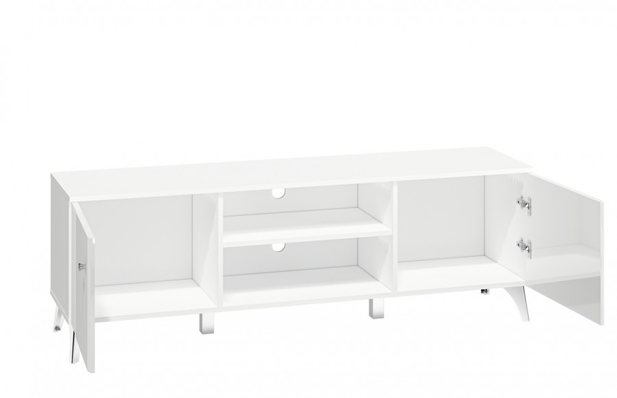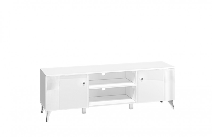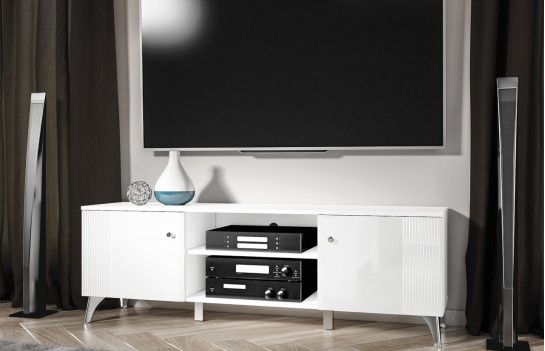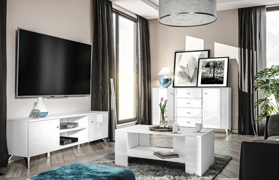 Szafka RTV VILLA 06 - to prawdziwe arcydzieło nowoczesnej elegancji. Jej wyjątkowym elementem są pięknie frezowane fronty oraz chromowane nóżki i uchwyty. Meble wyróżniają się jasną kolorystyką, łącząc Alpejską Biel z Białym Połyskiem. Szafka VILLA to praktyczne rozwiązanie do przechowywania sprzętu audio-wideo. Składa się z dwudrzwiowej części oraz dwóch otwartych wnęk, które pozwalają na uporządkowane rozmieszczenie elektroniki i dodatków. Wszystkie szafki wyposażono w system cichego domyku, który zapewni płynne i bezszelestne zamykanie drzwi. W kolekcji VILLA znajdziesz różnorodne meble, takie jak stolik kawowy, półka ścienna, szafa, komoda oraz witryna niska i witryna wysoka.