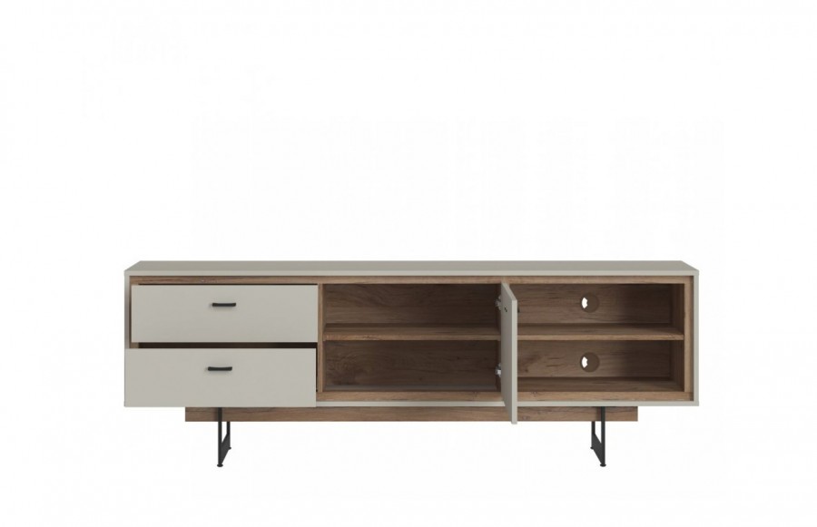 Szafka RTV RIVERO 1D2S - to kompleksowe centrum multimedialne. Wyposażona w dwie pojemne szuflady na akcesoria, jednodrzwiową szafkę z półką na płyty oraz dwie wnęki na dekodery i konsole, zapewnia funkcjonalność i przestrzeń. Wnęki posiadają otwory w tylnej płycie do prowadzenia przewodów i zapewnienia cyrkulacji powietrza. Duży blat pomieści nawet największy telewizor. Komoda jest wygodna w użytkowaniu dzięki zawiasom i prowadnicom z cichym domykiem. Jej eleganckie połączenie ciemnego dębu i szarości nadaje nowoczesny styl, idealny do nowoczesnych wnętrz. Może być używana samodzielnie lub jako część serii Rivero.