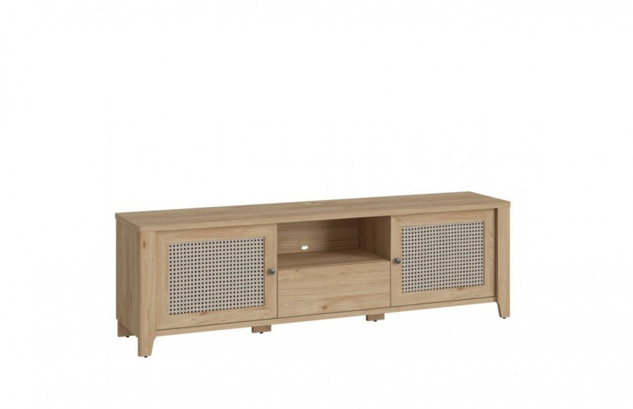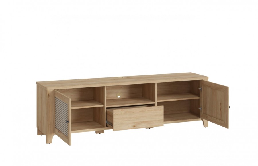 Szafka RTV CESTINO 2D1S - to połączenie płyty laminowanej i płyty MDF, zapewniające niezawodność i codzienną funkcjonalność. Dzięki pojemnym półkom, zarówno otwartym, jak i ukrytym za pełnymi frontami, będziesz mieć wszystkie niezbędne przedmioty zawsze pod ręką. Dodatkowo, praktyczna szuflada umożliwia uporządkowanie drobnych akcesoriów. Mebel posiada także wygodny otwór na okablowanie w tylnej części. Ta ponadczasowa i elegancka komoda RTV z kolekcji CESTINO świetnie komponuje się z ścienną półką, stolikiem kawowym i witryną z tej samej serii. Możesz dopasować ją do wystroju salonu w stylu klasycznej elegancji, boho lub skandynawskiego.