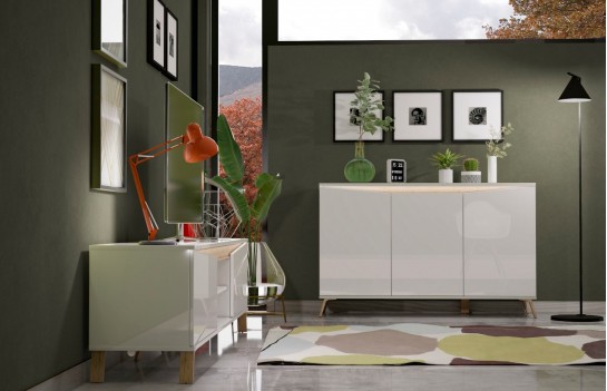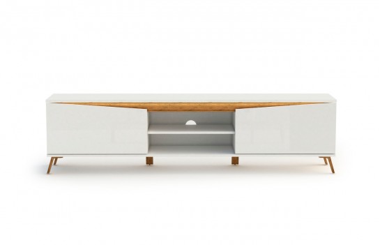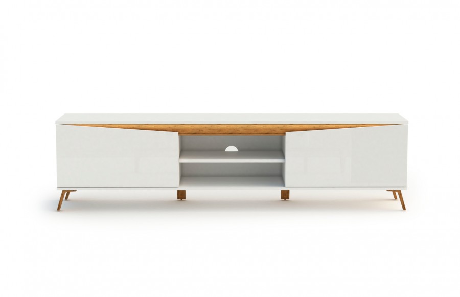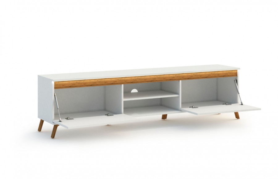Szafka RTV ALADYN - szafka RTV na nóżkach w stylu skandynawskim. To produkt pochodzenia włoskiego. Wykonana jest w wysokim standardzie, korpus i fronty to lakier biały połysk, natomiast nogi i aplikacje na szafce to folia w kolorze dębu. Opcjonalnie istnieje możliwość kupienia oświetlenia LED. To idealny mebel dla osób poszukujących eleganckich, a zarazem funkcjonalnych rozwiązań dla swoich mieszkań.