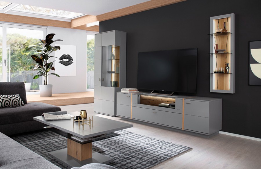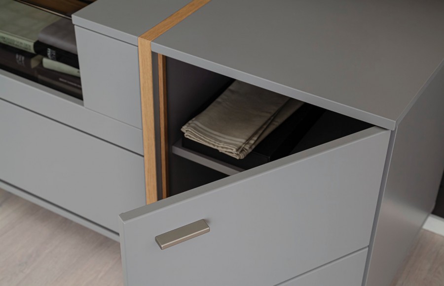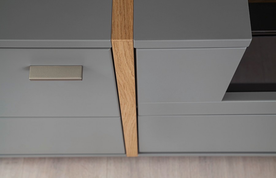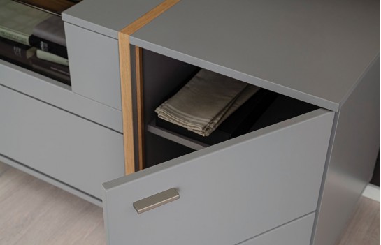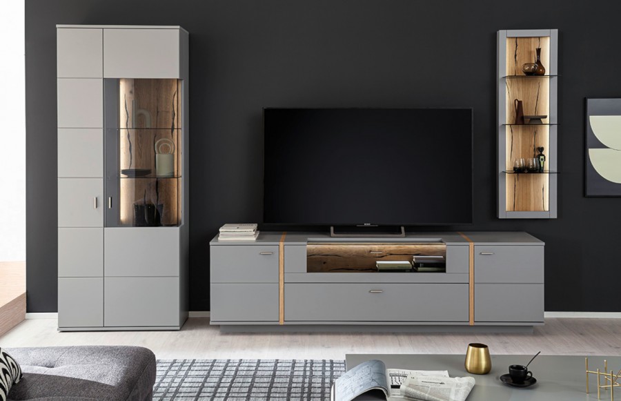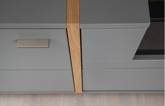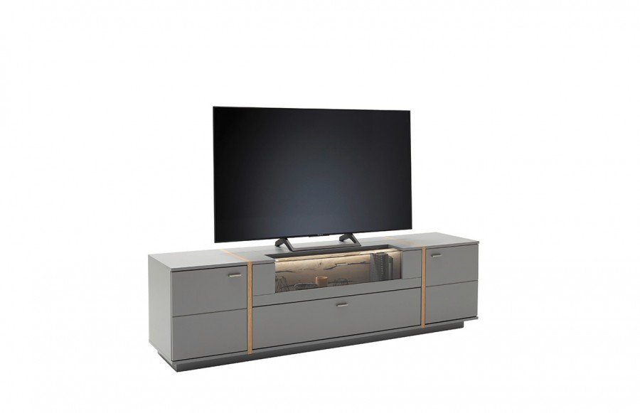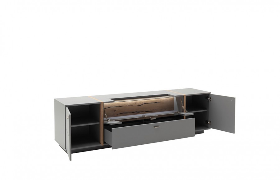 Szafka RTV SEVILLA - elegancka szafka RTV w kolorze szarym. Idealna do solanu lub sypialni. Istnieje możliwość dokupienia innych elementów kolekcji. Szafka RTV Sevilla jest solidnie wykonana, gdyż fronty to MDF, lakier antyczny szary mat, korpus to płyta laminowana, krawędzie ABS. Aplikacje dekoracyjne szafki RTV to okleina naturalna dębowa. Wszystkie szuflady i drzwi wyposażone są w cichy domyk. Uchwyty wykonane są z metalu, optyka nikiel mat. Istnieje możliwość dokupienia opcjonalnie oświetlenia LED sterowanego dotykowo lub pilotem.