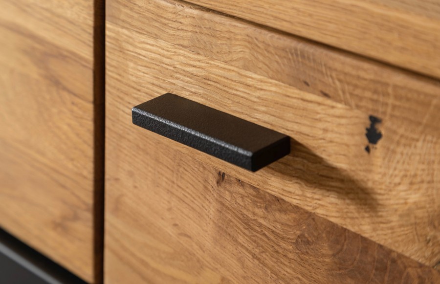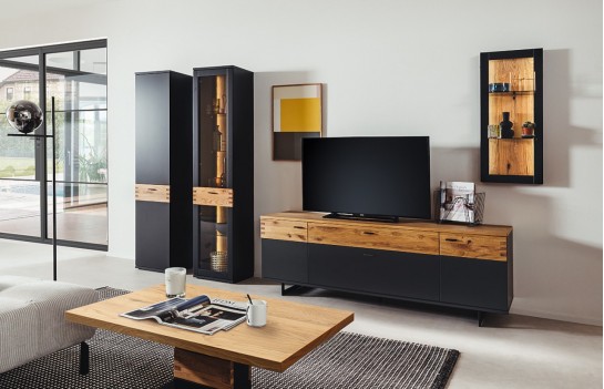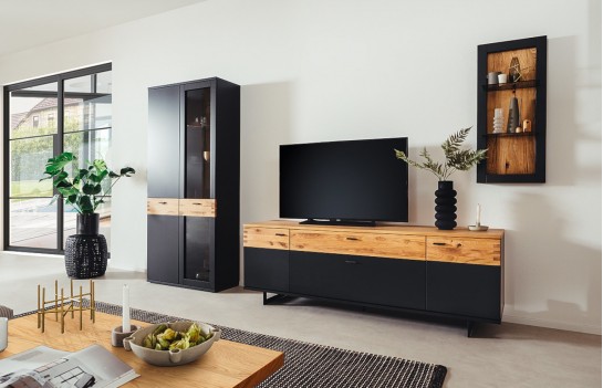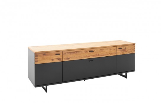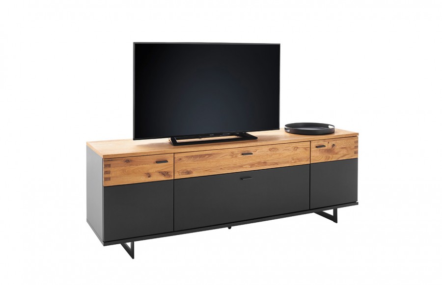 Szafka RTV CESENA - elegancka szafka RTV na płozach w kolorze czarno-szarym z elementami drewna. Idealna do solanu lub sypialni. Istnieje możliwość dokupienia innych elementów kolekcji. Szafka RTV wykonana jest w wysokim standardzie, gdyż fronty to MDF, lakier czarno-szary mat oraz drewno dąb dziki olejowany. Blat szafki RTV CESENA to okleina naturalna dębowa. Korpus wykonany jest z płyty laminowanej, krawędzie ABS czarno-szare. Wszystkie szuflady oraz drzwi wyposażone są w cichy domyk, natomiast nogi i uchwyty to metal. Istnieje możliwość dokupienia opcjonalnie oświetlenia LED sterowanego dotykowo lub pilotem.