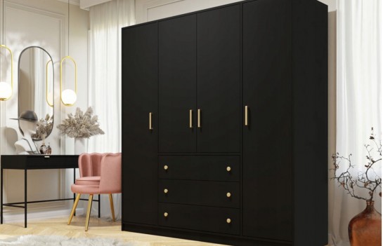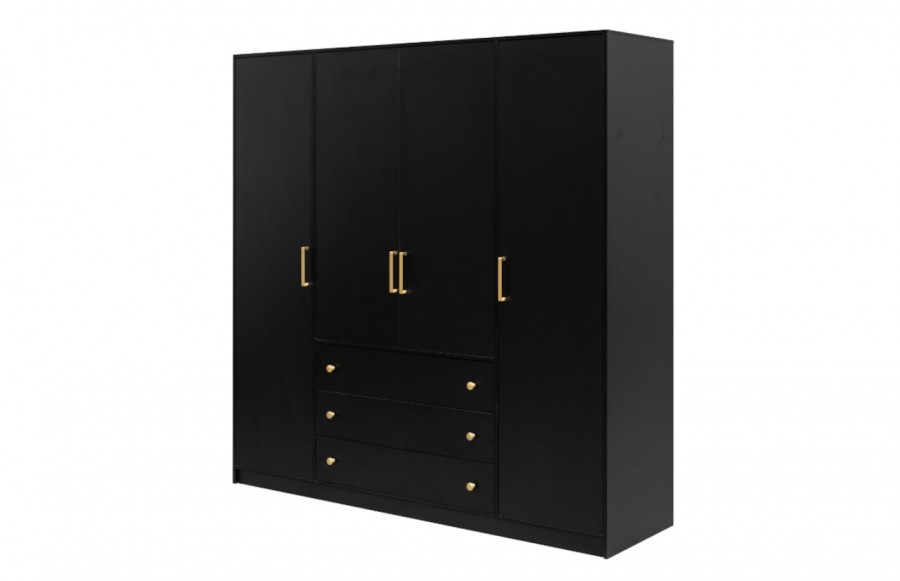 Szafa RETRO 4D - nowoczesna szafa w stylu glamour. Połączenie czarnego koloru ze złotymi uchwytami tworzy niezwykle elegancki i ekskluzywny wizerunek mebla. To ponadczasowy model, który sprawdzi się zarówno w sypialni, salonie, garderobie czy przedpokoju. Szafa Retro posiada trzy szuflady, jak i tradycyjnie otwierane fronty. Mebel charakteryzuje duża ilość praktycznych półek.