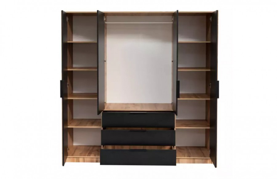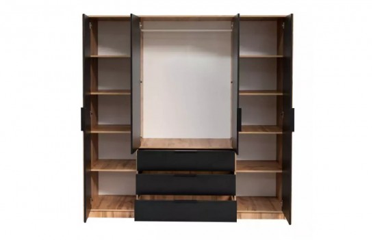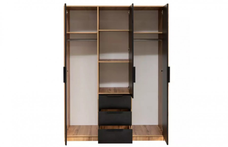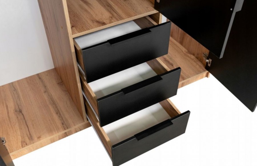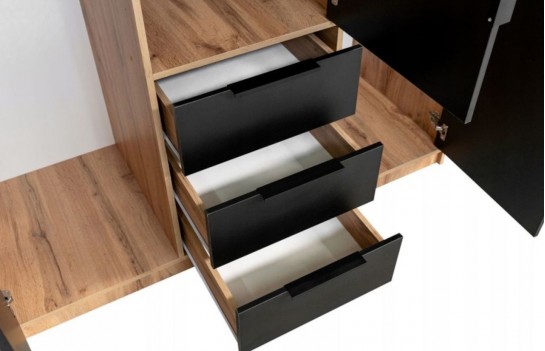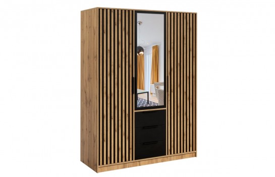 Szafa BALI LUX - klasyczna szafa z lamelami w stylu loftowym. To idealny model dla miłośników nietypowych wzorów. Połączenie koloru czarnego z dąb wotan oraz lamelami nadaje szafie designerskiego charakteru. Dzięki swojej funkcjonalności szafa doskonale sprawdzi się w sypialni, salonie czy pokoju młodzieżowym. Posiada wystarczającą ilość miejsca na ubrania i inne niezbędne akcesoria. Szafa BALI LUX występuje w wersji 3-drzwiowej i 4-drzwiowej. Różnią się one wymiarami i ilością drzwi uchylnych.