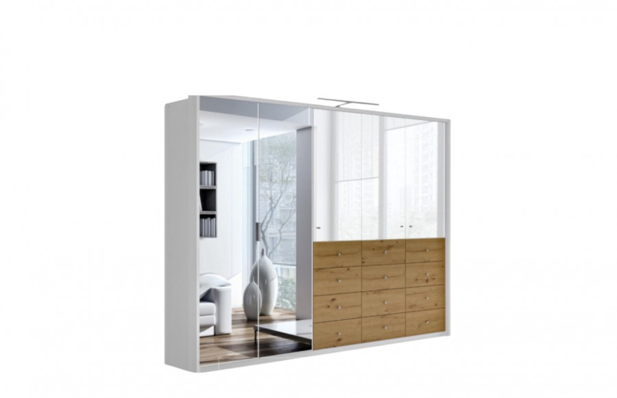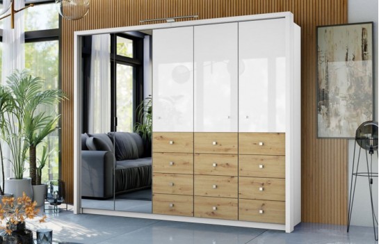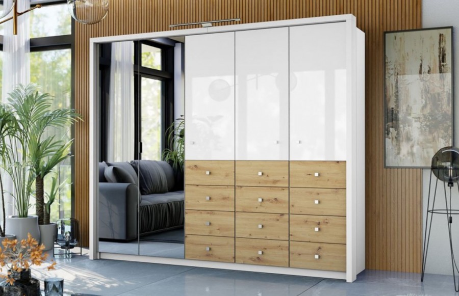 Szafa BOLIWIA 255 - to idealnie zaplanowana przestrzeń z mnóstwem półek, dwoma drążkami na wieszaki i aż 12 pojemnymi szufladami. Jej ponadczasowy design w białym połysku z dębowymi akcentami pasuje do większości wnętrz. Wykonana z trwałej płyty laminowanej, gwarantuje jakość i trwałość. Jej atrakcyjny, nowoczesny wygląd z lustrzanymi frontami w połączeniu z drewnianymi elementami zachwyci miłośników designu. Wnętrze jest praktyczne i pojemne, co zapewnia dużo miejsca do przechowywania. Szafa przesuwna BOLIWIA łączy funkcjonalność, styl i trwałość, zadowalając najbardziej wymagających klientów.