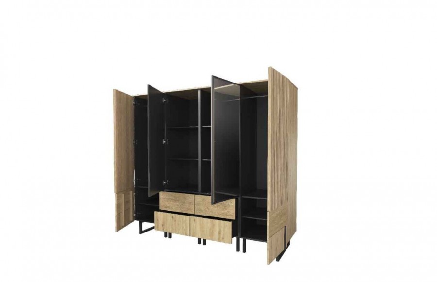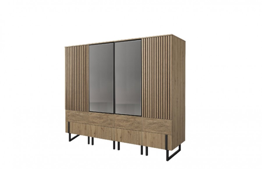 Szafa GINTARO IV - to pojemna garderoba, która doskonale pomieści odzież wierzchnią i pomoże zachować porządek. Wyposażona w cztery praktyczne szuflady i sześć drzwi, w tym jedno z lustrem i ozdobnymi lamelami. Mebel wykonany z litego drewna i naturalnej okleiny, co gwarantuje jego trwałość i wyjątkowy wygląd. Dzięki systemowi push-to-open otwieranie i zamykanie drzwi jest łatwe i ciche, zapewniając wygodę użytkowania przez wiele lat.
