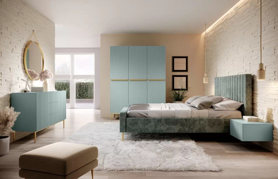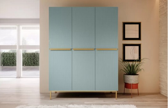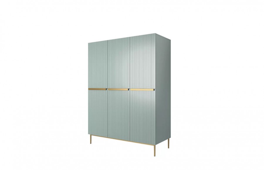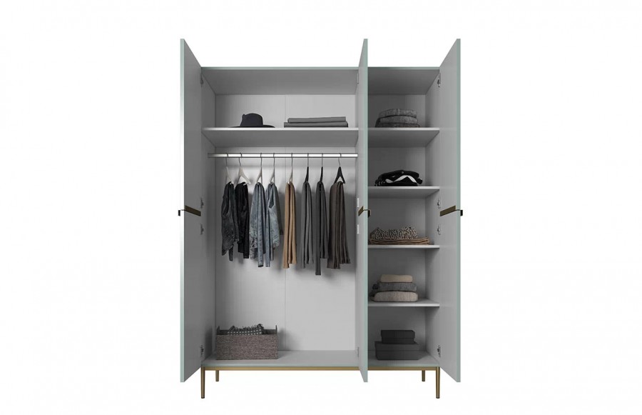 Szafa NICOLE - to elegancki mebel w modnym odcieniu szałwii, doskonale współgrający ze złotymi elementami. Idealna do nowoczesnej sypialni lub salonu, nadaje wnętrzu wyjątkowy charakter. To funkcjonalna szafa z podziałem na dwie strefy: jedna zawiera drążek i półkę, druga pięć głębokich wnęk. Wykonana z wysokiej jakości płyty MDF, zarówno na korpusie, jak i froncie, z solidnymi złotymi uchwytami. Szafa NICOLE to praktyczne i eleganckie rozwiązanie dla Twojego wnętrza.