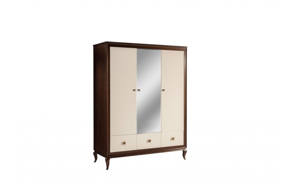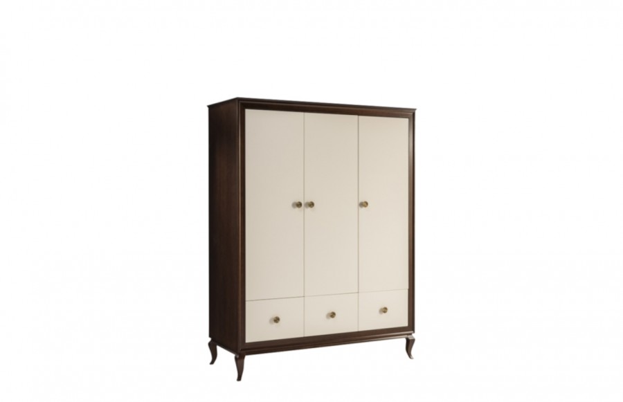 Szafa NICEA 3D - to doskonałe połączenie naturalnej okleiny w ciepłym odcieniu brązu i kontrastujących, jasnych frontów. Smukłe nóżki nadają meblom oryginalnego charakteru, a złote uchwyty w formie rozet dodają im elegancji. Kompozycja tej szafy to trzy eleganckie fronty, które kryją w sobie przestronne półki, drążek na wieszaki oraz trzy funkcjonalne szuflady. W centralnym froncie szafy znajduje się lustrzane wykończenie, które nie tylko spełnia funkcję praktyczną, ale także wizualnie powiększa przestrzeń. To rozwiązanie, które dodaje elegancji i nowoczesnego charakteru wnętrzu. Ta wyjątkowa szafa to nie tylko doskonałe rozwiązanie do przechowywania ubrań i innych przedmiotów, ale także element dekoracyjny, który wnosi wyjątkowy urok do każdego pomieszczenia. Kolekcja NICEA została stworzona z myślą o przestronnych wnętrzach, zarówno nowoczesnych, jak i stylowych, aby dostarczyć im wyjątkowego wyglądu.