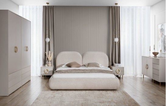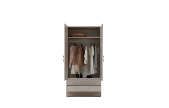 Szafa NUBO - to elegancka szafa z ryflowanymi frontami szuflad, które dodają jej dekoracyjnego i geometrycznego charakteru. Złote uchwyty w kształcie koła nie tylko są praktyczne, ale także nadają jej subtelny, biżuteryjny wygląd. Szafa posiada trzy pojemne szuflady, idealne do przechowywania drobnych elementów garderoby. Szafa z drążkiem zapewnia miejsce do powieszenia sukienek, koszul lub płaszczy. Dzięki wysokiej jakości wykonania, ten model pozostaje w doskonałej formie przez długie lata użytkowania.
