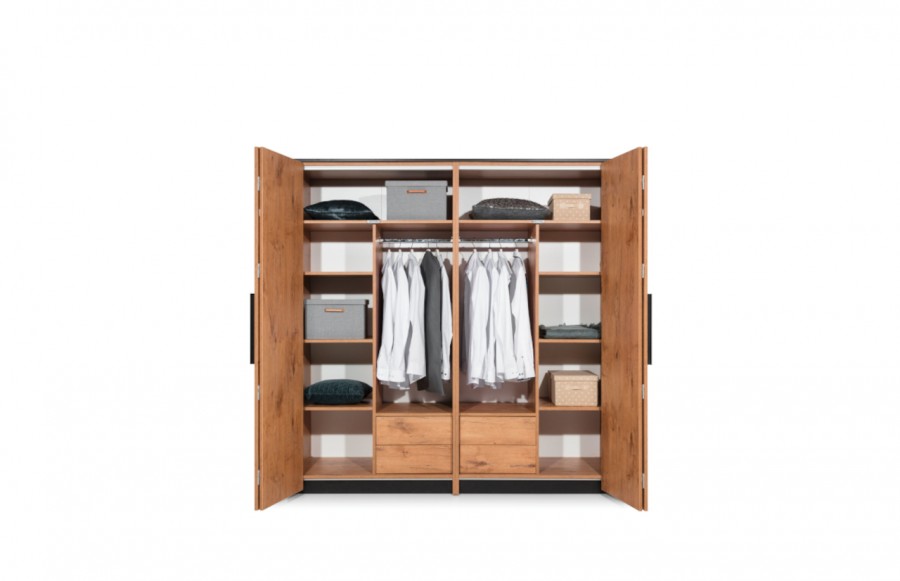 Szafa LOFT - w dekorze dąb lancelot to nie tylko piękny odcień, ale także wyjątkowa przytulność, którą wniesie do Twojego wnętrza. Jej czterodrzwiowa konstrukcja zapewnia obfitą przestrzeń do przechowywania, a cztery pojemne szuflady pomogą Ci uporządkować drobne elementy garderoby. Dzięki ośmiu praktycznym półkom łatwo poukładasz odzież i obuwie według pory roku lub rodzaju, a dwa drążki umożliwią zawieszenie koszul czy sukienek. To mebel, który nie tylko zachwyca wyglądem, ale także jest funkcjonalny.
