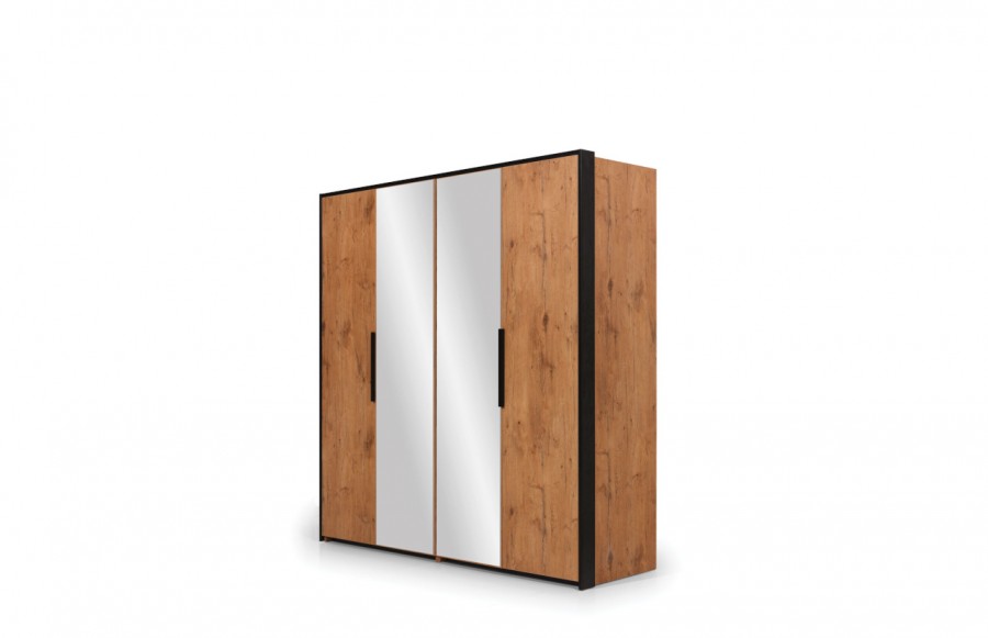 Szafa LOFT Z LUSTREM - w dekorze dąb karmel to nie tylko piękny odcień, ale także wyjątkowa przytulność, którą wniesie do Twojego wnętrza. Jej czterodrzwiowa konstrukcja zapewnia obfitą przestrzeń do przechowywania, a cztery pojemne szuflady pomogą Ci uporządkować drobne elementy garderoby. Dzięki ośmiu praktycznym półkom łatwo poukładasz odzież i obuwie według pory roku lub rodzaju, a dwa drążki umożliwią zawieszenie koszul czy sukienek. To mebel, który nie tylko zachwyca wyglądem, ale także jest funkcjonalny.
