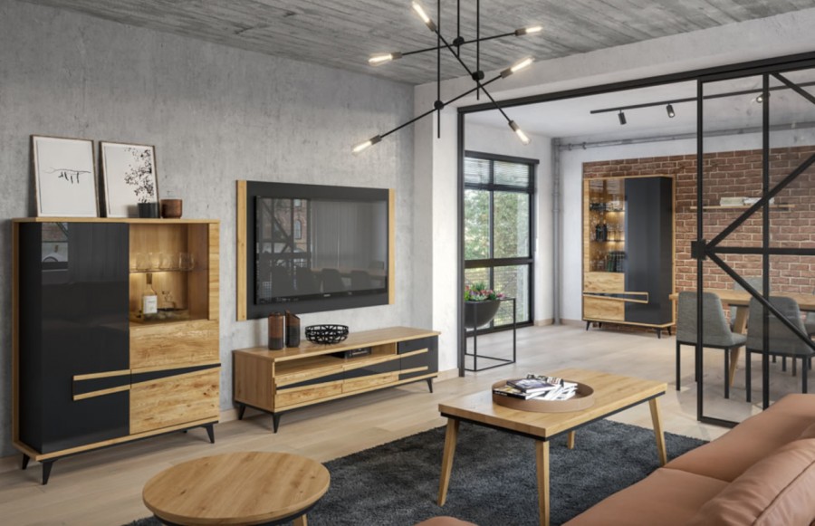 Witryna ETNA - to bryła, która zachwyci miłośników naturalnego piękna i elegancji. Połączenie głęboko strukturyzowanych frontów drewnianych ze szkłem nadaje jej niezwykle nowoczesnego wyglądu. Cała kolekcja mebli urzeka prostymi bryłami w stylu industrialnym, a uwagę przykuwają bardzo charakterystyczne, niespotykane pochwyty oraz metalowe nogi. To wszystko nadaje jej lekkości i designerskiego stylu. Witryna ETNA to bardzo funkcjonalny i pakowny mebel, w którym dzięki przeszkleniu wyeksponujesz cenne pamiątki i ozdoby. W kolekcji ETNA znajdziesz również meble do swojego salonu, jadalni oraz sypialni. Całość wyposażona została w nowoczesne rozwiązania, takie jak ciche domykanie drzwi oraz system oświetlenia LED.