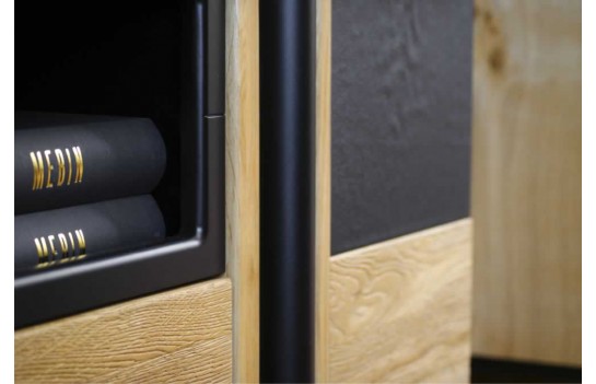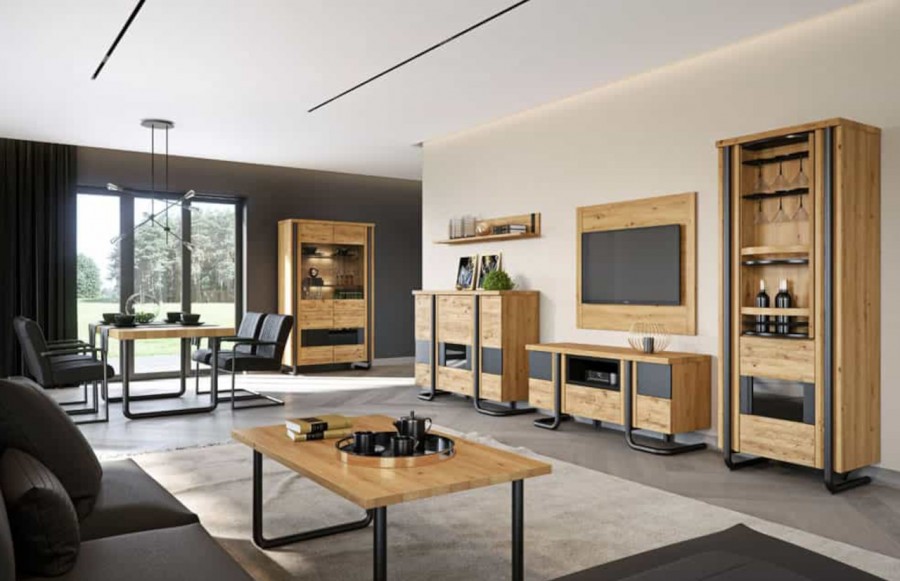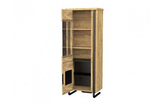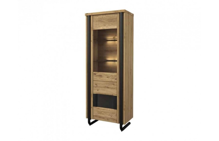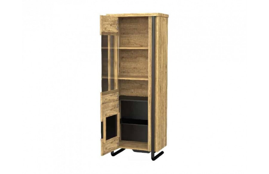 Witryna OMEGA - to niezwykłe połączenie naturalnych materiałów takich jak drewno, skóra naturalna oraz metal. Fronty witryny wykonane zostały z drewna dzikiego dębu z doskonale uwidocznionym usłojeniem. Dodatkowo zostały one wzbogacone czarnymi aplikacjami ze skóry naturalnej, które nadają bryle niepowtarzalnego charakteru oraz elegancji. Gięte, stalowe elementy doskonale podkreślają industrialny charakter kolekcji. Witryna OMEGA stanowi wyjątkowe uzupełnienie mebli w salonie, gabinecie lub jadalni, a przeszklone elementy pozwolą na wyeksponowanie cennych drobiazgów. Całość kolekcji cechuje minimalizm, funkcjonalność oraz wysoka jakość materiałów. W meblach OMEGA zastosowano nowoczesne rozwiązania - takie jak oświetlenie LED z włącznikiem bezdotykowym oraz system otwierania drzwi push to open.