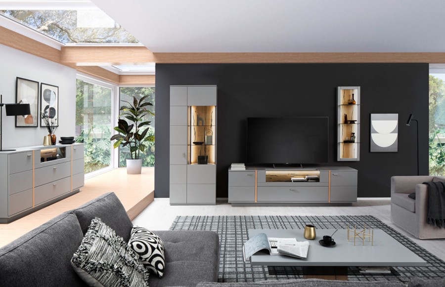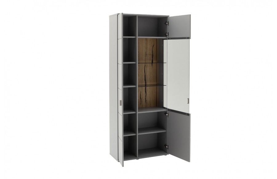 Witryna SEVILLA - to elegancka witryna w kolorze szarego matu. Idealnie sprawdzi się w przestrzeni jadalnianej lub salonowej. Smukła i wyjątkowa sylwetka witryny doskonale wyeksponuje kolekcję cennych drobiazgów i wzbogaci estetycznie każde wnętrze. Witryna wykonana jest z wysokiej jakości komponentów, gdyż fronty mebla to MDF lakierowany w kolorze matowej, antycznej szarości, korpus zaś to płyta laminowana. Dekoracyjne aplikacje witryny to naturalna okleina dębowa. Drzwi wyposażone są w funkcję cichego domyku a uchwyty wykonane są z metalu. Aby jeszcze bardziej podkreślić wyjątkowość witryny istnieje możliwość dokupienia oświetlenia LED - sterowanego dotykowo lub pilotem.