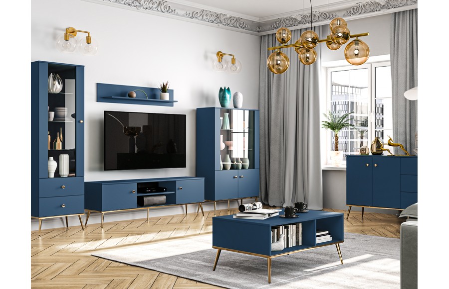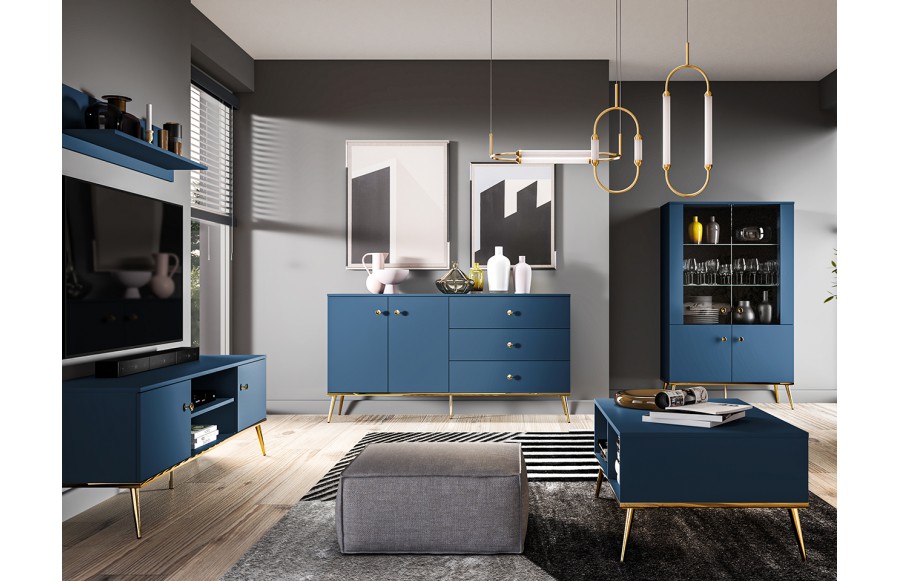 Witryna MARINE - bez wątpienia przypadnie do gustu wielbicielom stylu glamour. Ta luksusowa witryna została wykonana z najwyższej jakości płyty MDF. Niezwykle popularny obecnie odcień głębokiego granatu nada aranżacji elegancji i designerskiego wyglądu. Skośne nóżki oraz uchwyty w kolorze złota nadają efektownego wizerunku. To idealne rozwiązanie dla osób, które pragną podkreślić urok swoich cennych pamiątek w unikatowy oraz niebanalny sposób. Wszystkie szafki wyposażono w system cichego domyku, który zapewni płynne i bezszelestne zamykanie drzwi. Aby jeszcze bardziej podkreślić urok produktów MARINE, producent wyposażył je w oświetlenie, które dostępne jest w standardzie. Meble sprawdzą się również w pokoju dziennym urządzonym w klasycznym stylu, tworząc unikatowy wystrój pełen elegancji oraz wdzięku. W kolekcji mebli MARINE znajdziesz również meble potrzebne do urządzenia salonu i jadalni.