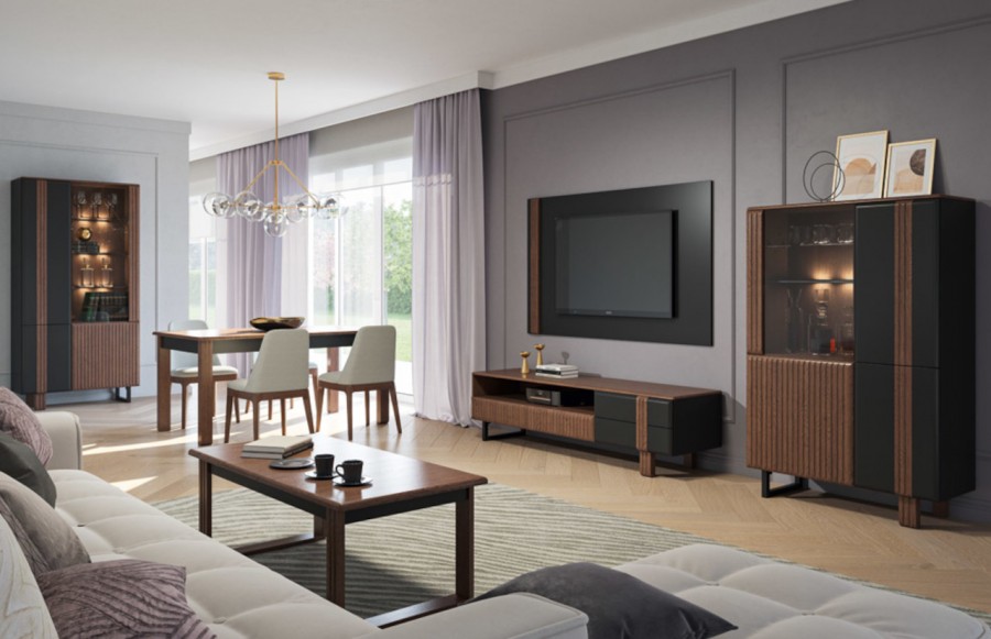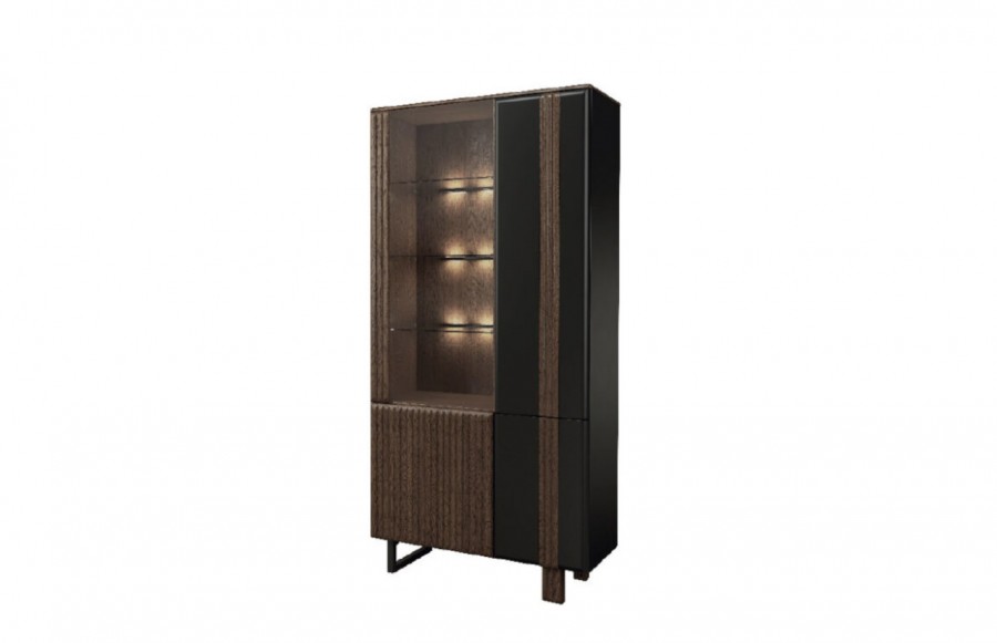 Witryna ISLA - to bryła która łączy klasyczną harmonię z nowoczesną formą w doskonałym guście. Jej wyjątkowym elementem są fronty wykonane z litego drewna dębowego, dostępne w szlachetnych odcieniach rustikal/notte lub rustikal/bianco, zestawione z elementami w kolorze czarnym. Prosta, nowoczesna forma brył doskonale współgra z oryginalnym wykończeniem w postaci pionowych lameli na frontach szafek, witryn i komód, oraz brązowym szkłem antisol. W witrynie ISLA znajdziesz praktyczny system otwierania drzwi push to open, który ułatwia korzystanie z mebla. Dodatkowo, przyciemnione szyby pozwalają eksponować cenne przedmioty oświetlone delikatnym ledowym światłem, co tworzy wyjątkowy dekoracyjny efekt. Bogactwo rodzajów mebli w kolekcji pozwoli Ci stworzyć unikalne aranżacje strefy wypoczynku, zadowalając nawet najbardziej wymagających użytkowników.